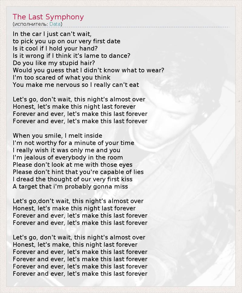 Сидя в машине, жду не дождусь, Когда ты выйдешь - это наше первое свидание. Ты не будешь против, если я возьму тебя за руку? Ничего, если я против танцев? Тебе нравится моя глупая прическа? Ты догадалась, что я не знал, что надеть? Мне даже страшно подумать, о чём твои мысли. Я так нервничаю, что не могу есть. Давай, не жди, эта ночь почти закончилась Честно, давай сделаем так, чтобы эта ночь длилась вечно Вечно... Давай сделаем так, чтобы это длилось вечно Вечно... Давай сделаем так, чтобы это длилось вечно Когда ты улыбаешься, я таю внутри. Я не заслуживаю минуты твоего времени. Я хочу, чтобы были только я и ты Я ревную тебя ко всем в комнате Пожалуйста, не смотри на меня такими глазами. Пожалуйста, не намекай, что ты талантливо врешь. Я трепещу от мысли о нашем первом поцелуе, Который я, вероятно, упущу. Давай, не жди, эта ночь почти закончилась Честно, давай сделаем так, чтобы эта ночь длилась вечно Вечно... Давай сделаем так, чтобы это длилось вечно Вечно... Давай сделаем так, чтобы это длилось вечно Давай, не жди, эта ночь почти закончилась Честно, давай сделаем так, чтобы эта ночь длилась вечно Вечно... Давай сделаем так, чтобы это длилось вечно Вечно... Давай сделаем так, чтобы это длилось вечно Вечно... Давай сделаем так, чтобы это длилось вечно Вечно... Давай сделаем так, чтобы это длилось вечно