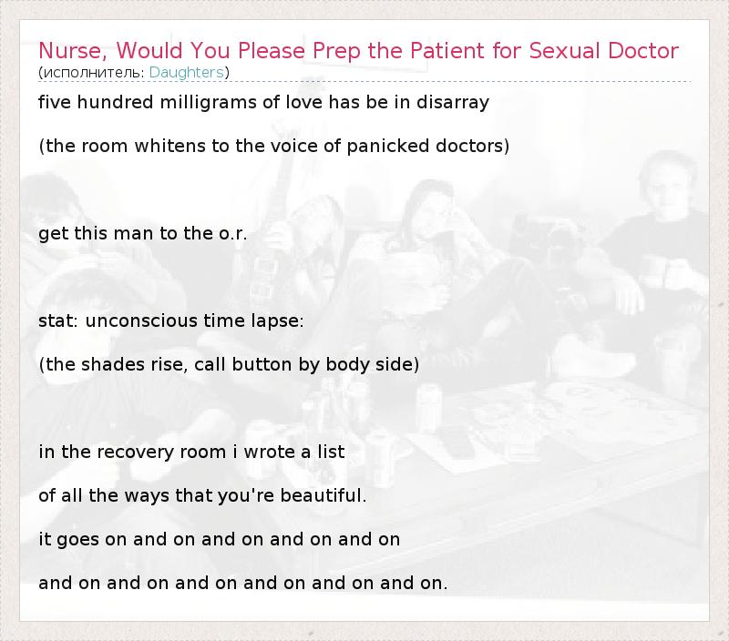 А как ты думаешь, о чем песня "Nurse, Would You Please Prep the Patient for Sexual Doctor" ?