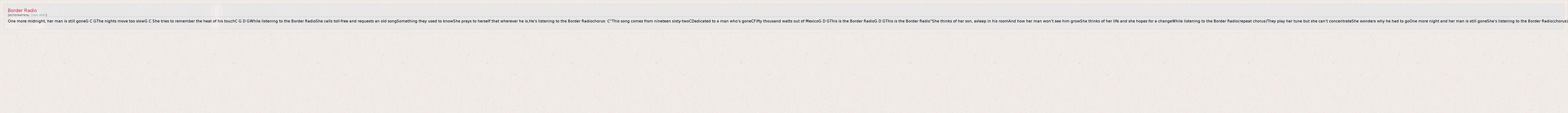 One more midnight, her man is still goneG C GThe nights move too slowG C She tries to remember the heat of his touchC G D GWhile listening to the Border RadioShe calls toll-free and requests an old songSomething they used to knowShe prays to herself that wherever he is,He's listening to the Border Radiochorus: C"This song comes from nineteen sixty-twoCDedicated to a man who's goneCFifty thousand watts out of MexicoG D GThis is the Border RadioG D GThis is the Border Radio"She thinks of her son, asleep in his roomAnd how her man won't see him growShe thinks of her life and she hopes for a changeWhile listening to the Border Radio(repeat chorus)They play her tune but she can't concentrateShe wonders why he had to goOne more night and her man is still goneShe's listening to the Border Radio(chorus)