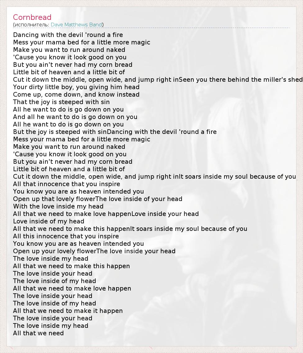 Dancing with the devil 'round a fire Mess your mama bed for a little more magic Make you want to run around naked 'Cause you know it look good on you But you ain't never had my corn bread Little bit of heaven and a little bit of Cut it down the middle, open wide, and jump right inSeen you there behind the miller's shed Your dirty little boy, you giving him head Come up, come down, and know instead That the joy is steeped with sin All he want to do is go down on you And all he want to do is go down on you All he want to do is go down on you But the joy is steeped with sinDancing with the devil 'round a fire Mess your mama bed for a little more magic Make you want to run around naked 'Cause you know it look good on you But you ain't never had my corn bread Little bit of heaven and a little bit of Cut it down the middle, open wide, and jump right inIt soars inside my soul because of you All that innocence that you inspire You know you are as heaven intended you Open up that lovely flowerThe love inside of your head With the love inside my head All that we need to make love happenLove inside your head Love inside of my head All that we need to make this happenIt soars inside my soul because of you All this innocence that you inspire You know you are as heaven intended you Open up your lovely flowerThe love inside your head The love inside my head All that we need to make this happen The love inside your head The love inside of my head All that we need to make love happen The love inside your head The love inside of my head All that we need to make it happen The love inside your head The love inside my head All that we need
