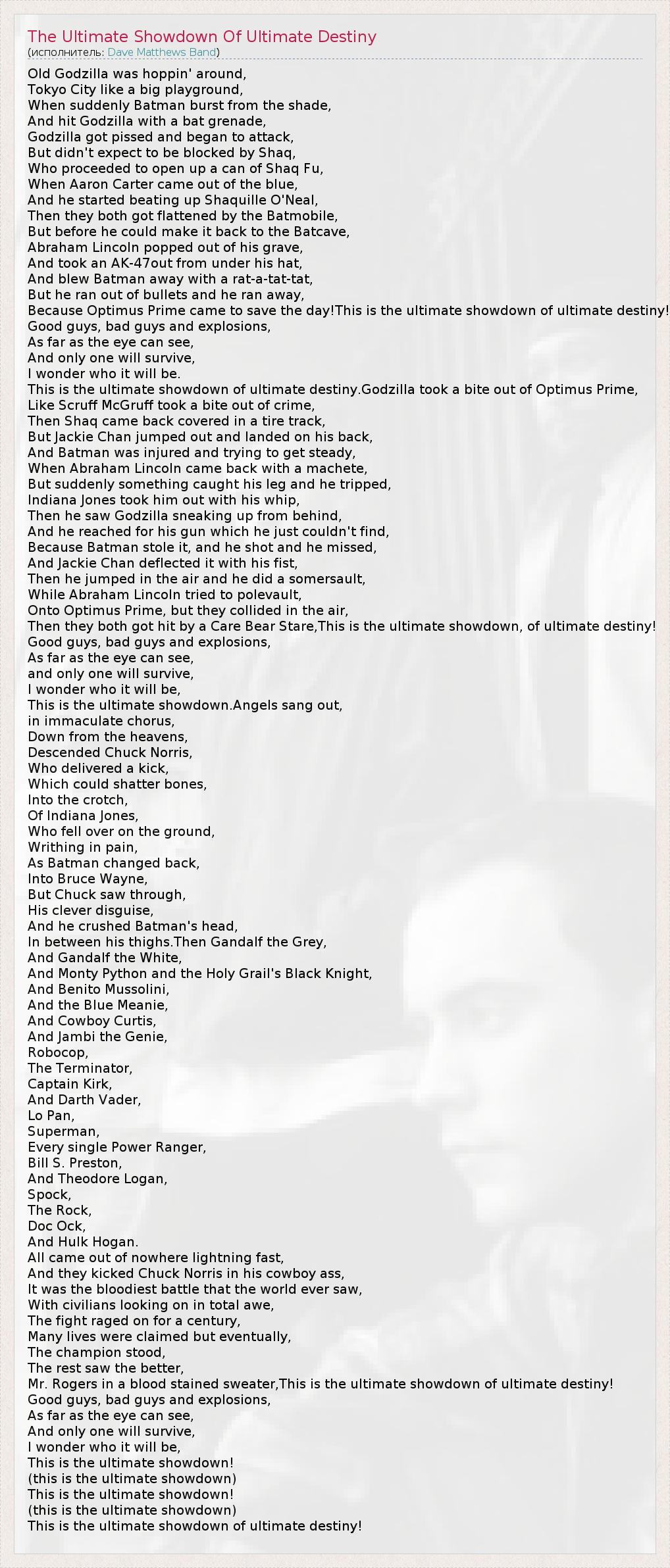 Old Godzilla was hoppin' around, Tokyo City like a big playground, When suddenly Batman burst from the shade, And hit Godzilla with a bat grenade, Godzilla got pissed and began to attack, But didn't expect to be blocked by Shaq, Who proceeded to open up a can of Shaq Fu, When Aaron Carter came out of the blue, And he started beating up Shaquille O'Neal, Then they both got flattened by the Batmobile, But before he could make it back to the Batcave, Abraham Lincoln popped out of his grave, And took an AK-47out from under his hat, And blew Batman away with a rat-a-tat-tat, But he ran out of bullets and he ran away, Because Optimus Prime came to save the day!This is the ultimate showdown of ultimate destiny! Good guys, bad guys and explosions, As far as the eye can see, And only one will survive, I wonder who it will be. This is the ultimate showdown of ultimate destiny.Godzilla took a bite out of Optimus Prime, Like Scruff McGruff took a bite out of crime, Then Shaq came back covered in a tire track, But Jackie Chan jumped out and landed on his back, And Batman was injured and trying to get steady, When Abraham Lincoln came back with a machete, But suddenly something caught his leg and he tripped, Indiana Jones took him out with his whip, Then he saw Godzilla sneaking up from behind, And he reached for his gun which he just couldn't find, Because Batman stole it, and he shot and he missed, And Jackie Chan deflected it with his fist, Then he jumped in the air and he did a somersault, While Abraham Lincoln tried to polevault, Onto Optimus Prime, but they collided in the air, Then they both got hit by a Care Bear Stare,This is the ultimate showdown, of ultimate destiny! Good guys, bad guys and explosions, As far as the eye can see, and only one will survive, I wonder who it will be, This is the ultimate showdown.Angels sang out, in immaculate chorus, Down from the heavens, Descended Chuck Norris, Who delivered a kick, Which could shatter bones, Into the crotch, Of Indiana Jones, Who fell over on the ground, Writhing in pain, As Batman changed back, Into Bruce Wayne, But Chuck saw through, His clever disguise, And he crushed Batman's head, In between his thighs.Then Gandalf the Grey, And Gandalf the White, And Monty Python and the Holy Grail's Black Knight, And Benito Mussolini, And the Blue Meanie, And Cowboy Curtis, And Jambi the Genie, Robocop, The Terminator, Captain Kirk, And Darth Vader, Lo Pan, Superman, Every single Power Ranger, Bill S. Preston, And Theodore Logan, Spock, The Rock, Doc Ock, And Hulk Hogan. All came out of nowhere lightning fast, And they kicked Chuck Norris in his cowboy ass, It was the bloodiest battle that the world ever saw, With civilians looking on in total awe, The fight raged on for a century, Many lives were claimed but eventually, The champion stood, The rest saw the better, Mr. Rogers in a blood stained sweater,This is the ultimate showdown of ultimate destiny! Good guys, bad guys and explosions, As far as the eye can see, And only one will survive, I wonder who it will be, This is the ultimate showdown! (this is the ultimate showdown) This is the ultimate showdown! (this is the ultimate showdown) This is the ultimate showdown of ultimate destiny!