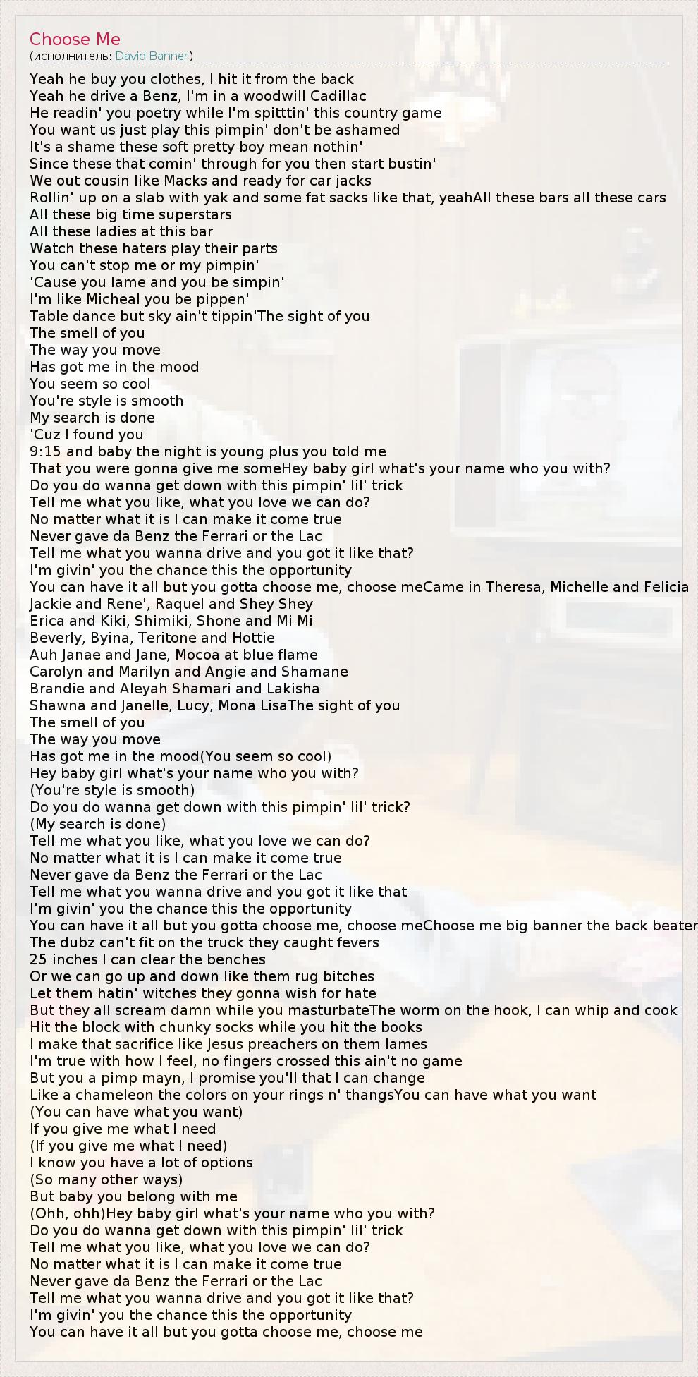 Yeah he buy you clothes, I hit it from the back Yeah he drive a Benz, I'm in a woodwill Cadillac He readin' you poetry while I'm spitttin' this country game You want us just play this pimpin' don't be ashamed It's a shame these soft pretty boy mean nothin' Since these that comin' through for you then start bustin' We out cousin like Macks and ready for car jacks Rollin' up on a slab with yak and some fat sacks like that, yeahAll these bars all these cars All these big time superstars All these ladies at this bar Watch these haters play their parts You can't stop me or my pimpin' 'Cause you lame and you be simpin' I'm like Micheal you be pippen' Table dance but sky ain't tippin'The sight of you The smell of you The way you move Has got me in the mood You seem so cool You're style is smooth My search is done 'Cuz I found you 9:15 and baby the night is young plus you told me That you were gonna give me someHey baby girl what's your name who you with? Do you do wanna get down with this pimpin' lil' trick Tell me what you like, what you love we can do? No matter what it is I can make it come true Never gave da Benz the Ferrari or the Lac Tell me what you wanna drive and you got it like that? I'm givin' you the chance this the opportunity You can have it all but you gotta choose me, choose meCame in Theresa, Michelle and Felicia Jackie and Rene', Raquel and Shey Shey Erica and Kiki, Shimiki, Shone and Mi Mi Beverly, Byina, Teritone and Hottie Auh Janae and Jane, Mocoa at blue flame Carolyn and Marilyn and Angie and Shamane Brandie and Aleyah Shamari and Lakisha Shawna and Janelle, Lucy, Mona LisaThe sight of you The smell of you The way you move Has got me in the mood(You seem so cool) Hey baby girl what's your name who you with? (You're style is smooth) Do you do wanna get down with this pimpin' lil' trick? (My search is done) Tell me what you like, what you love we can do? No matter what it is I can make it come true Never gave da Benz the Ferrari or the Lac Tell me what you wanna drive and you got it like that I'm givin' you the chance this the opportunity You can have it all but you gotta choose me, choose meChoose me big banner the back beater The dubz can't fit on the truck they caught fevers 25 inches I can clear the benches Or we can go up and down like them rug bitches Let them hatin' witches they gonna wish for hate But they all scream damn while you masturbateThe worm on the hook, I can whip and cook Hit the block with chunky socks while you hit the books I make that sacrifice like Jesus preachers on them lames I'm true with how I feel, no fingers crossed this ain't no game But you a pimp mayn, I promise you'll that I can change Like a chameleon the colors on your rings n' thangsYou can have what you want (You can have what you want) If you give me what I need (If you give me what I need) I know you have a lot of options (So many other ways) But baby you belong with me (Ohh, ohh)Hey baby girl what's your name who you with? Do you do wanna get down with this pimpin' lil' trick Tell me what you like, what you love we can do? No matter what it is I can make it come true Never gave da Benz the Ferrari or the Lac Tell me what you wanna drive and you got it like that? I'm givin' you the chance this the opportunity You can have it all but you gotta choose me, choose me