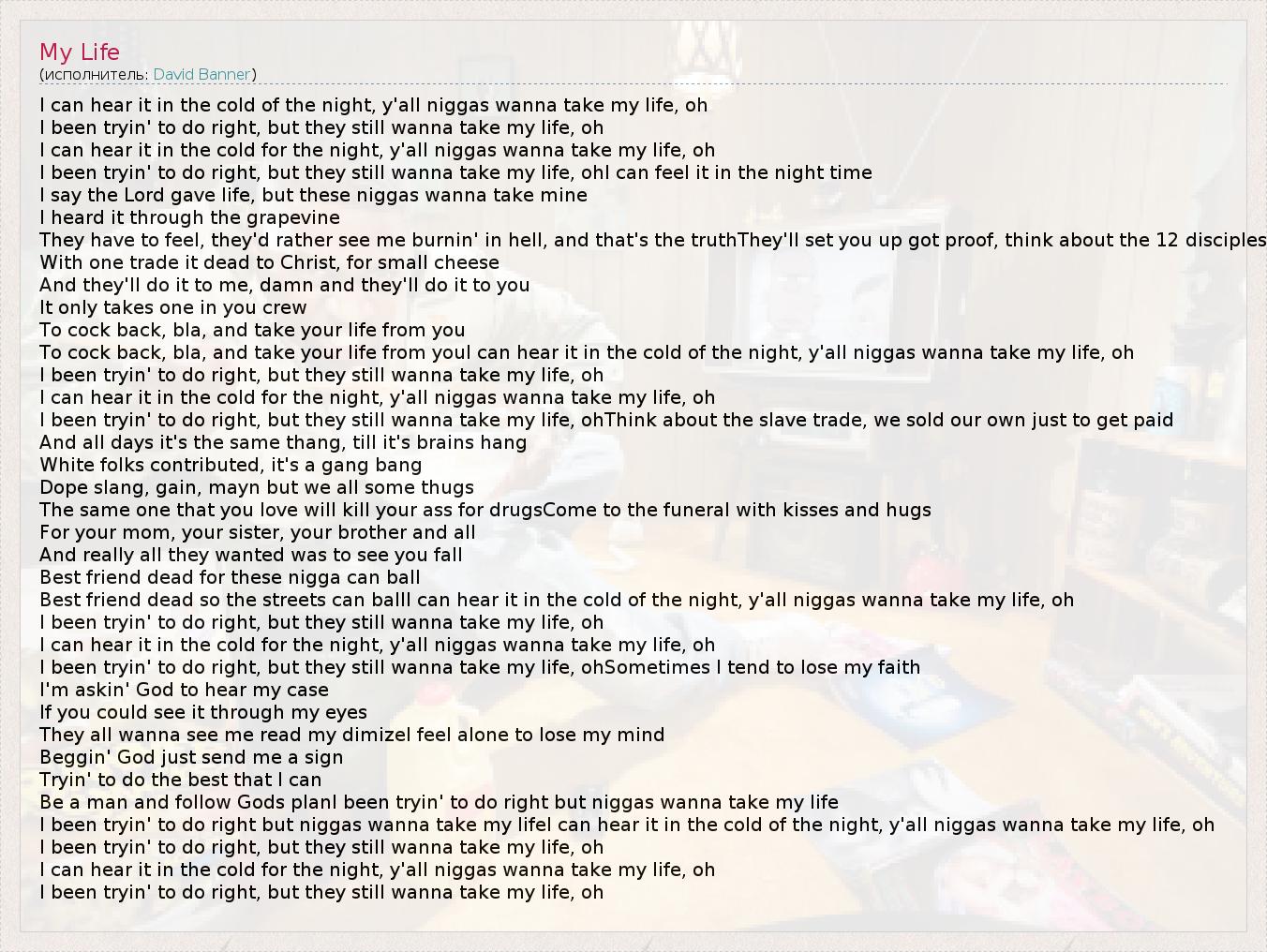 I been tryin' to do right but niggas wanna take my lifeI can hear it in the cold of the night, y'all niggas wanna take my life, oh