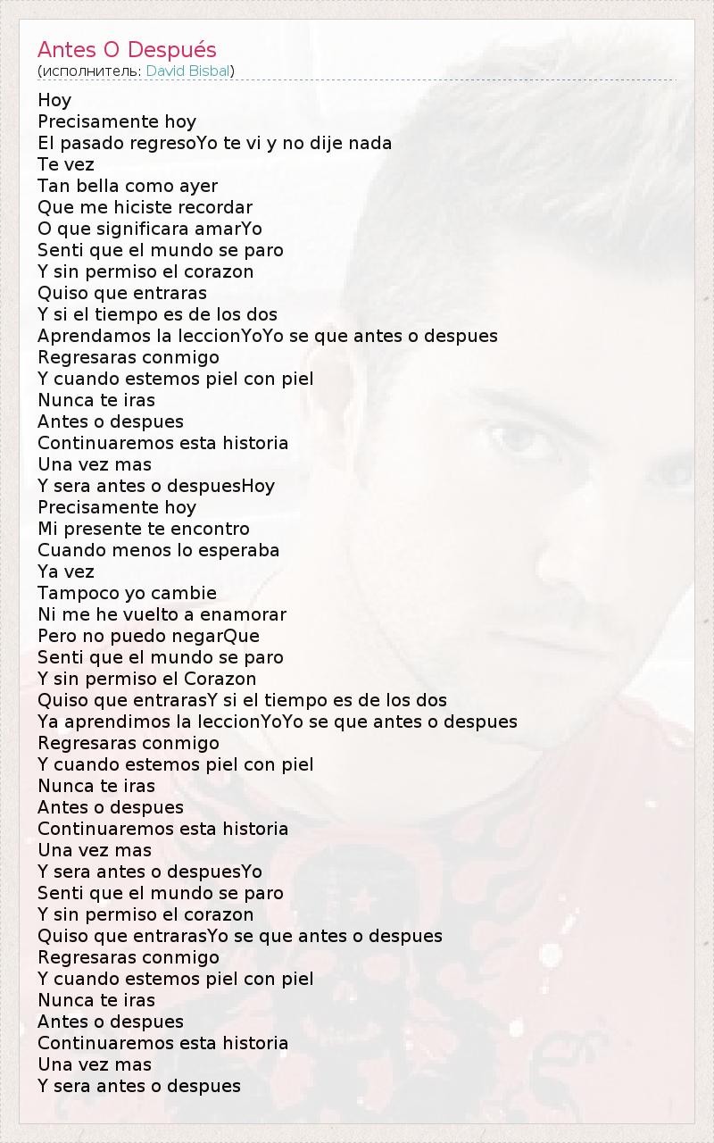 Это интересно:Давид Бисбал дебютировал в испанской "Фабрике звезд" - Operacion Triunfo. Его первый альбом Corazon Latino завоевал слушателей во всем испаноговорящем мире, а хиты с него не раз становились платиновыми. Стиль Давида - зажигательный и романтические песни латино.