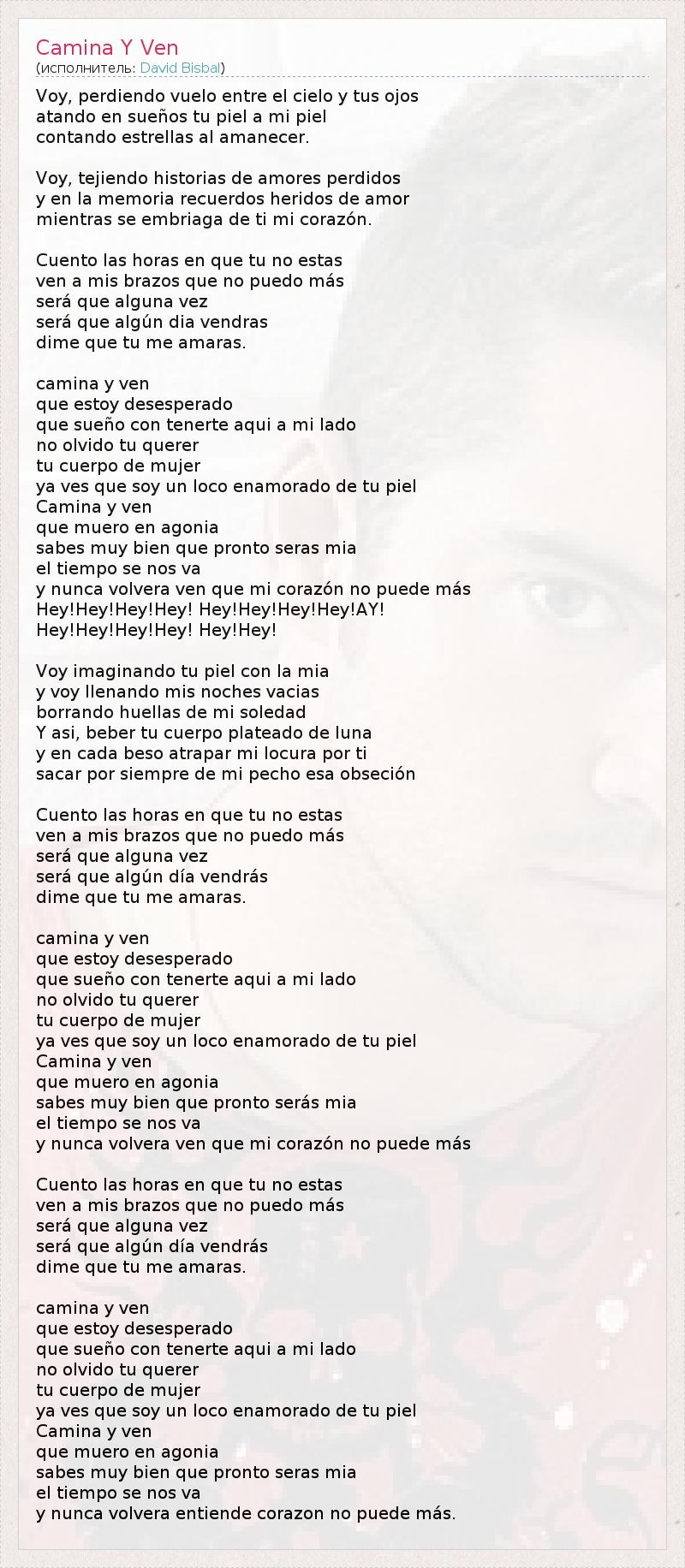 Voy, perdiendo vuelo entre el cielo y tus ojos atando en sueños tu piel a mi piel contando estrellas al amanecer. Voy, tejiendo historias de amores perdidos y en la memoria recuerdos heridos de amor mientras se embriaga de ti mi corazón. Cuento las horas en que tu no estas ven a mis brazos que no puedo más será que alguna vez será que algún dia vendras dime que tu me amaras. camina y ven que estoy desesperado que sueño con tenerte aqui a mi lado no olvido tu querer tu cuerpo de mujer ya ves que soy un loco enamorado de tu piel Camina y ven que muero en agonia sabes muy bien que pronto seras mia el tiempo se nos va y nunca volvera ven que mi corazón no puede más Hey!Hey!Hey!Hey! Hey!Hey!Hey!Hey!AY! Hey!Hey!Hey!Hey! Hey!Hey! Voy imaginando tu piel con la mia y voy llenando mis noches vacias borrando huellas de mi soledad Y asi, beber tu cuerpo plateado de luna y en cada beso atrapar mi locura por ti sacar por siempre de mi pecho esa obseción Cuento las horas en que tu no estas ven a mis brazos que no puedo más será que alguna vez será que algún día vendrás dime que tu me amaras. camina y ven que estoy desesperado que sueño con tenerte aqui a mi lado no olvido tu querer tu cuerpo de mujer ya ves que soy un loco enamorado de tu piel Camina y ven que muero en agonia sabes muy bien que pronto serás mia el tiempo se nos va y nunca volvera ven que mi corazón no puede más Cuento las horas en que tu no estas ven a mis brazos que no puedo más será que alguna vez será que algún día vendrás dime que tu me amaras. camina y ven que estoy desesperado que sueño con tenerte aqui a mi lado no olvido tu querer tu cuerpo de mujer ya ves que soy un loco enamorado de tu piel Camina y ven que muero en agonia sabes muy bien que pronto seras mia el tiempo se nos va y nunca volvera entiende corazon no puede más.