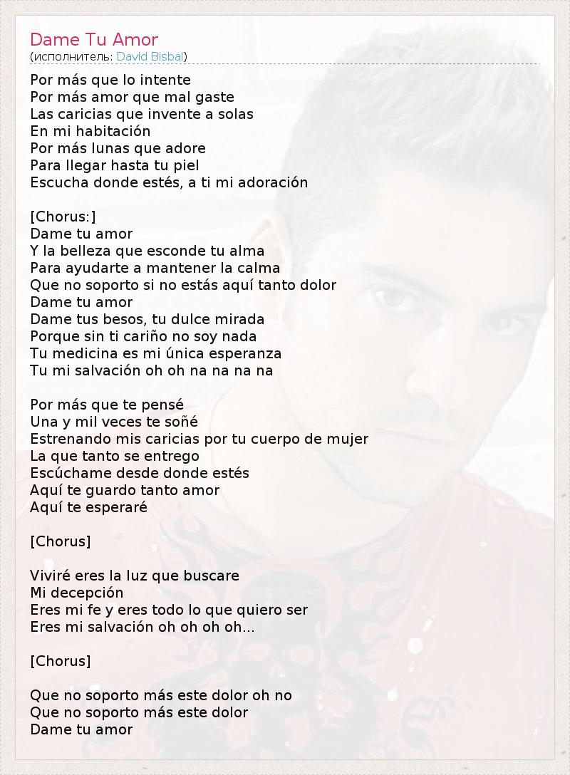 Por más que lo intente Por más amor que mal gaste Las caricias que invente a solas En mi habitación Por más lunas que adore Para llegar hasta tu piel Escucha donde estés, a ti mi adoración [Chorus:] Dame tu amor Y la belleza que esconde tu alma Para ayudarte a mantener la calma Que no soporto si no estás aquí tanto dolor Dame tu amor Dame tus besos, tu dulce mirada Porque sin ti cariño no soy nada Tu medicina es mi única esperanza Tu mi salvación oh oh na na na na Por más que te pensé Una y mil veces te soñé Estrenando mis caricias por tu cuerpo de mujer La que tanto se entrego Escúchame desde donde estés Aquí te guardo tanto amor Aquí te esperaré [Chorus] Viviré eres la luz que buscare Mi decepción Eres mi fe y eres todo lo que quiero ser Eres mi salvación oh oh oh oh... [Chorus] Que no soporto más este dolor oh no Que no soporto más este dolor Dame tu amor