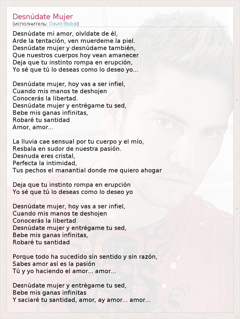 Desnúdate mi amor, olvídate de él, Arde la tentación, ven muerdeme la piel. Desnúdate mujer y desnúdame también, Que nuestros cuerpos hoy vean amanecer Deja que tu instinto rompa en erupción, Yo sé que tú lo deseas como lo deseo yo... Desnúdate mujer, hoy vas a ser infiel, Cuando mis manos te deshojen Conocerás la libertad. Desnúdate mujer y entrégame tu sed, Bebe mis ganas infinitas, Robaré tu santidad Amor, amor... La lluvia cae sensual por tu cuerpo y el mío, Resbala en sudor de nuestra pasión. Desnuda eres cristal, Perfecta la intimidad, Tus pechos el manantial donde me quiero ahogar Deja que tu instinto rompa en erupción Yo sé que tú lo deseas como lo deseo yo Desnúdate mujer, hoy vas a ser infiel, Cuando mis manos te deshojen Conocerás la libertad. Desnúdate mujer y entrégame tu sed, Bebe mis ganas infinitas, Robaré tu santidad Porque todo ha sucedido sin sentido y sin razón, Sabes amor así es la pasión Tú y yo haciendo el amor... amor... Desnúdate mujer y entrégame tu sed, Bebe mis ganas infinitas Y saciaré tu santidad, amor, ay amor... amor...
