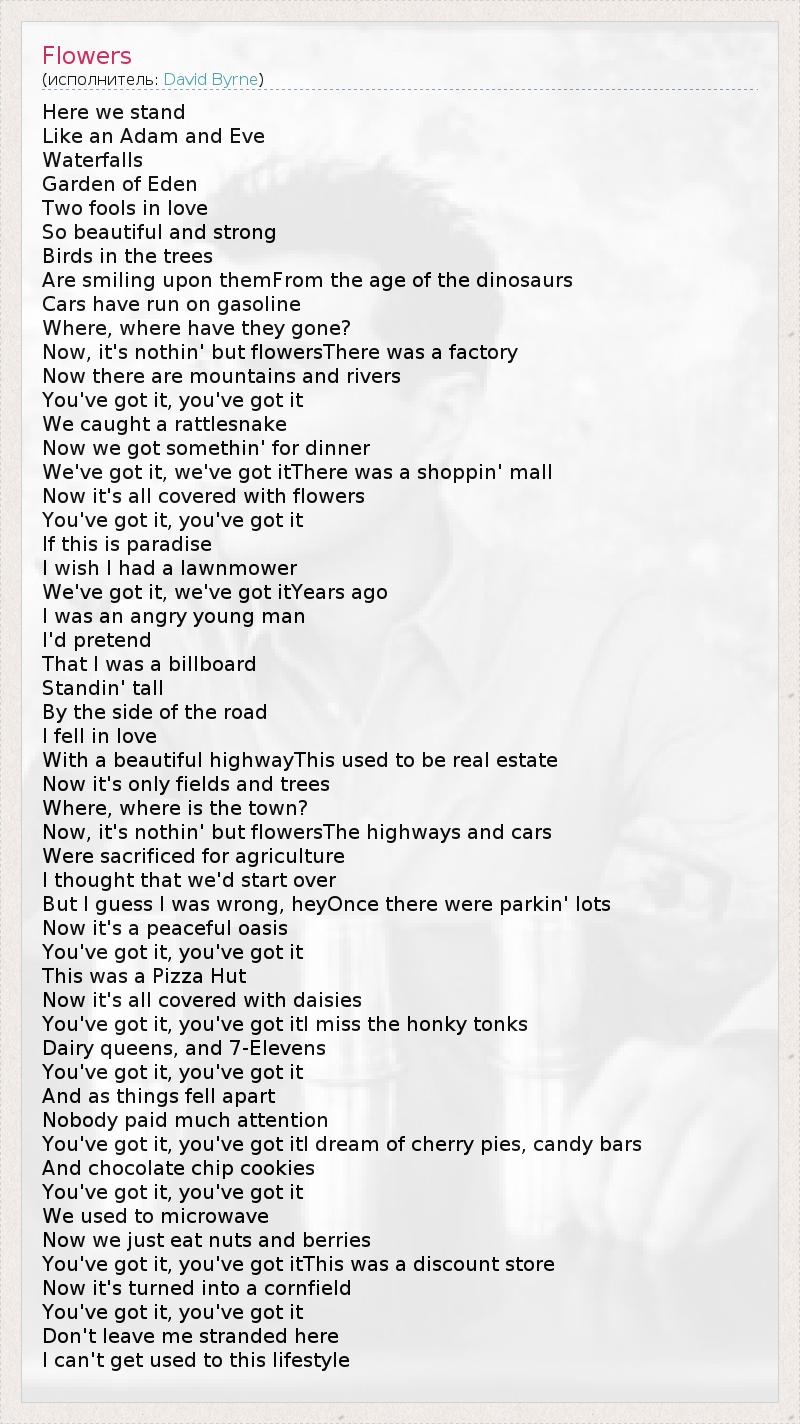 Here we stand Like an Adam and Eve Waterfalls Garden of Eden Two fools in love So beautiful and strong Birds in the trees Are smiling upon themFrom the age of the dinosaurs Cars have run on gasoline Where, where have they gone? Now, it's nothin' but flowersThere was a factory Now there are mountains and rivers You've got it, you've got it We caught a rattlesnake Now we got somethin' for dinner We've got it, we've got itThere was a shoppin' mall Now it's all covered with flowers You've got it, you've got it If this is paradise I wish I had a lawnmower We've got it, we've got itYears ago I was an angry young man I'd pretend That I was a billboard Standin' tall By the side of the road I fell in love With a beautiful highwayThis used to be real estate Now it's only fields and trees Where, where is the town? Now, it's nothin' but flowersThe highways and cars Were sacrificed for agriculture I thought that we'd start over But I guess I was wrong, heyOnce there were parkin' lots Now it's a peaceful oasis You've got it, you've got it This was a Pizza Hut Now it's all covered with daisies You've got it, you've got itI miss the honky tonks Dairy queens, and 7-Elevens You've got it, you've got it And as things fell apart Nobody paid much attention You've got it, you've got itI dream of cherry pies, candy bars And chocolate chip cookies You've got it, you've got it We used to microwave Now we just eat nuts and berries You've got it, you've got itThis was a discount store Now it's turned into a cornfield You've got it, you've got it Don't leave me stranded here I can't get used to this lifestyle