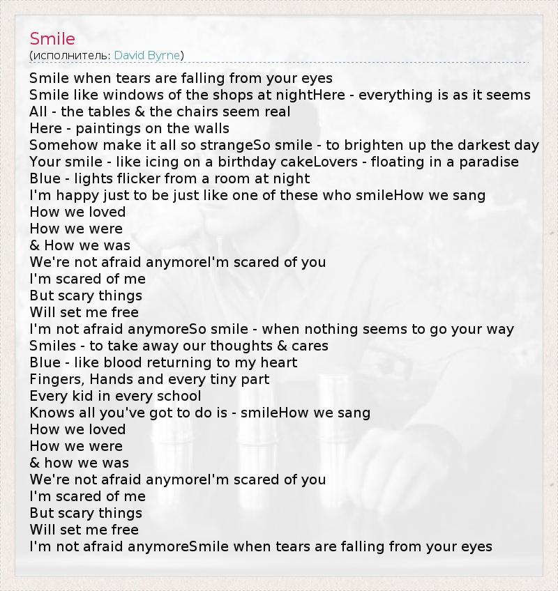 Smile when tears are falling from your eyes Smile like windows of the shops at nightHere - everything is as it seems All - the tables & the chairs seem real Here - paintings on the walls Somehow make it all so strangeSo smile - to brighten up the darkest day Your smile - like icing on a birthday cakeLovers - floating in a paradise Blue - lights flicker from a room at night I'm happy just to be just like one of these who smileHow we sang How we loved How we were & How we was We're not afraid anymoreI'm scared of you I'm scared of me But scary things Will set me free I'm not afraid anymoreSo smile - when nothing seems to go your way Smiles - to take away our thoughts & cares Blue - like blood returning to my heart Fingers, Hands and every tiny part Every kid in every school Knows all you've got to do is - smileHow we sang How we loved How we were & how we was We're not afraid anymoreI'm scared of you I'm scared of me But scary things Will set me free I'm not afraid anymoreSmile when tears are falling from your eyes