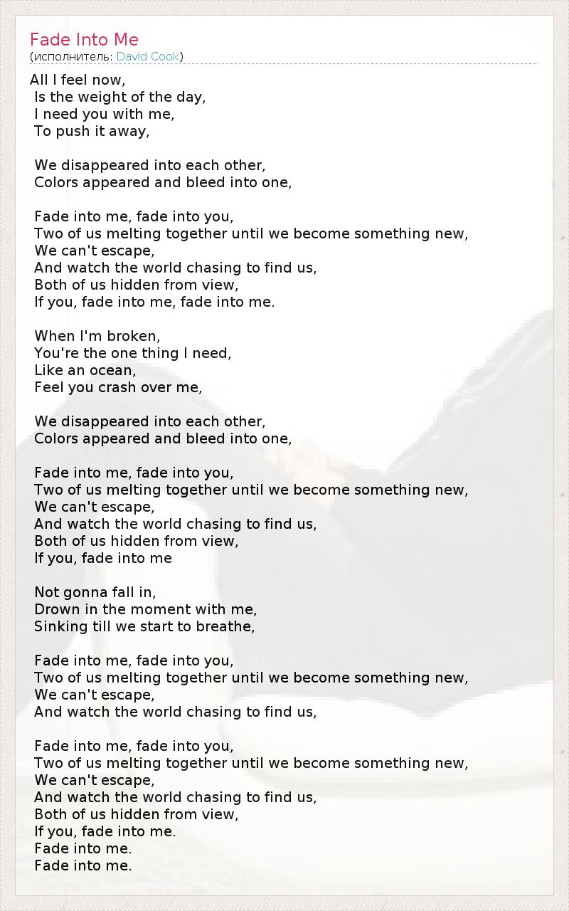 All I feel now, Is the weight of the day, I need you with me, To push it away, We disappeared into each other, Colors appeared and bleed into one, Fade into me, fade into you, Two of us melting together until we become something new, We can't escape, And watch the world chasing to find us, Both of us hidden from view, If you, fade into me, fade into me. When I'm broken, You're the one thing I need, Like an ocean, Feel you crash over me, We disappeared into each other, Colors appeared and bleed into one, Fade into me, fade into you, Two of us melting together until we become something new, We can't escape, And watch the world chasing to find us, Both of us hidden from view, If you, fade into me Not gonna fall in, Drown in the moment with me, Sinking till we start to breathe, Fade into me, fade into you, Two of us melting together until we become something new, We can't escape, And watch the world chasing to find us, Fade into me, fade into you, Two of us melting together until we become something new, We can't escape, And watch the world chasing to find us, Both of us hidden from view, If you, fade into me. Fade into me. Fade into me.