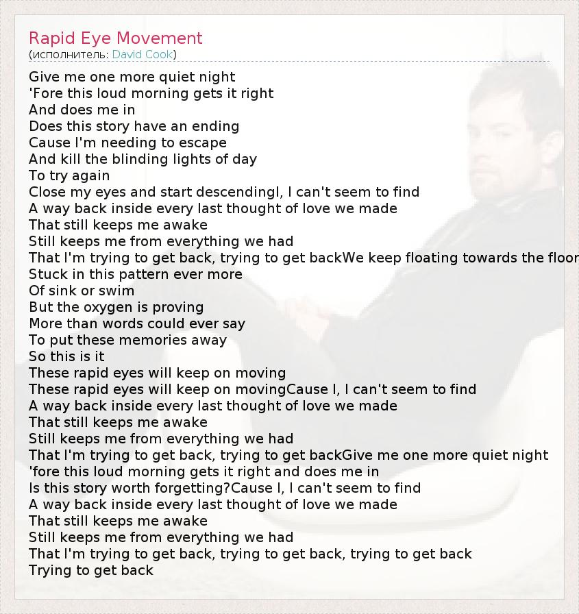Give me one more quiet night 'Fore this loud morning gets it right And does me in Does this story have an ending Cause I'm needing to escape And kill the blinding lights of day To try again Close my eyes and start descendingI, I can't seem to find A way back inside every last thought of love we made That still keeps me awake Still keeps me from everything we had That I'm trying to get back, trying to get backWe keep floating towards the floor Stuck in this pattern ever more Of sink or swim But the oxygen is proving More than words could ever say To put these memories away So this is it These rapid eyes will keep on moving These rapid eyes will keep on movingCause I, I can't seem to find A way back inside every last thought of love we made That still keeps me awake Still keeps me from everything we had That I'm trying to get back, trying to get backGive me one more quiet night 'fore this loud morning gets it right and does me in Is this story worth forgetting?Cause I, I can't seem to find A way back inside every last thought of love we made That still keeps me awake Still keeps me from everything we had That I'm trying to get back, trying to get back, trying to get back Trying to get back