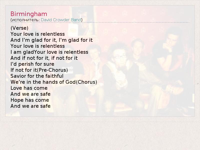 Это интересно:David Crowder Band - это американская христианская рок-группа из города Уэйко (Техас), образованная в конце 90-х годов и состоящая из 6 участников: вокалиста, гитариста и клавишника Дэвида Кроудера (David Crowder), гитариста и бэк-вокалиста Джека Паркера (Jack Parker), басиста и клавишника Майка Додсона (Mike Dodson), виолончелиста и гитариста Майка Хогана (Mike Hogan), барабанщика и перкуссиониста Джереми Буша (Jeremy "B-Wack"... продолжение