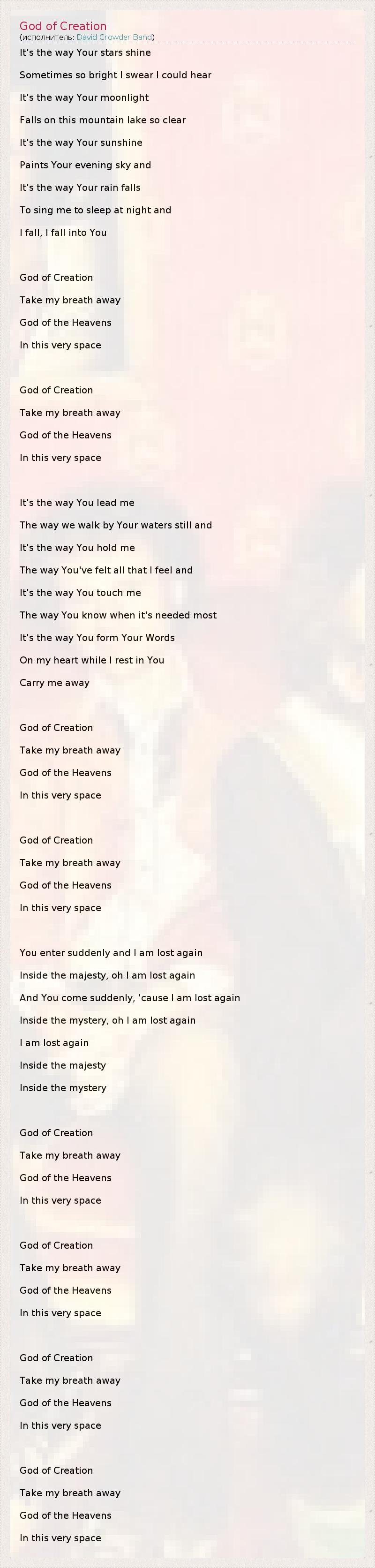 Это интересно:David Crowder Band - это американская христианская рок-группа из города Уэйко (Техас), образованная в конце 90-х годов и состоящая из 6 участников: вокалиста, гитариста и клавишника Дэвида Кроудера (David Crowder), гитариста и бэк-вокалиста Джека Паркера (Jack Parker), басиста и клавишника Майка Додсона (Mike Dodson), виолончелиста и гитариста Майка Хогана (Mike Hogan), барабанщика и перкуссиониста Джереми Буша (Jeremy "B-Wack"... продолжение