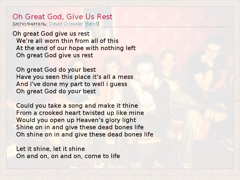 А как ты думаешь, о чем песня "Oh Great God, Give Us Rest" ?