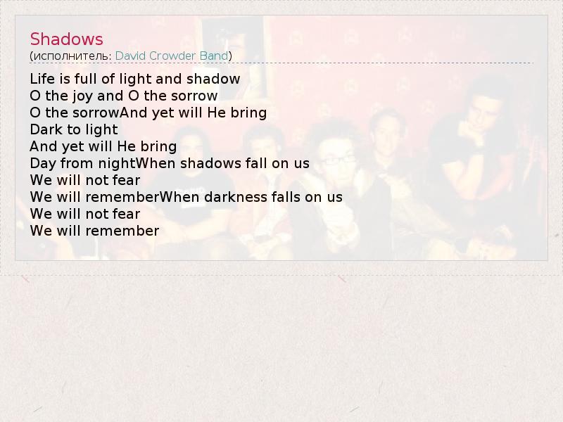 Life is full of light and shadow O the joy and O the sorrow O the sorrowAnd yet will He bring Dark to light And yet will He bring Day from nightWhen shadows fall on us We will not fear We will rememberWhen darkness falls on us We will not fear We will remember