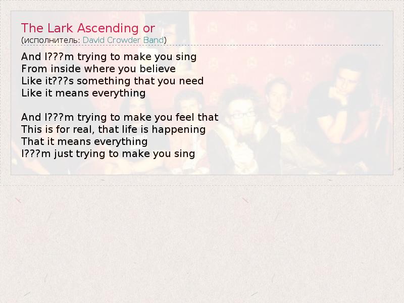Это интересно:David Crowder Band - это американская христианская рок-группа из города Уэйко (Техас), образованная в конце 90-х годов и состоящая из 6 участников: вокалиста, гитариста и клавишника Дэвида Кроудера (David Crowder), гитариста и бэк-вокалиста Джека Паркера (Jack Parker), басиста и клавишника Майка Додсона (Mike Dodson), виолончелиста и гитариста Майка Хогана (Mike Hogan), барабанщика и перкуссиониста Джереми Буша (Jeremy "B-Wack"... продолжение