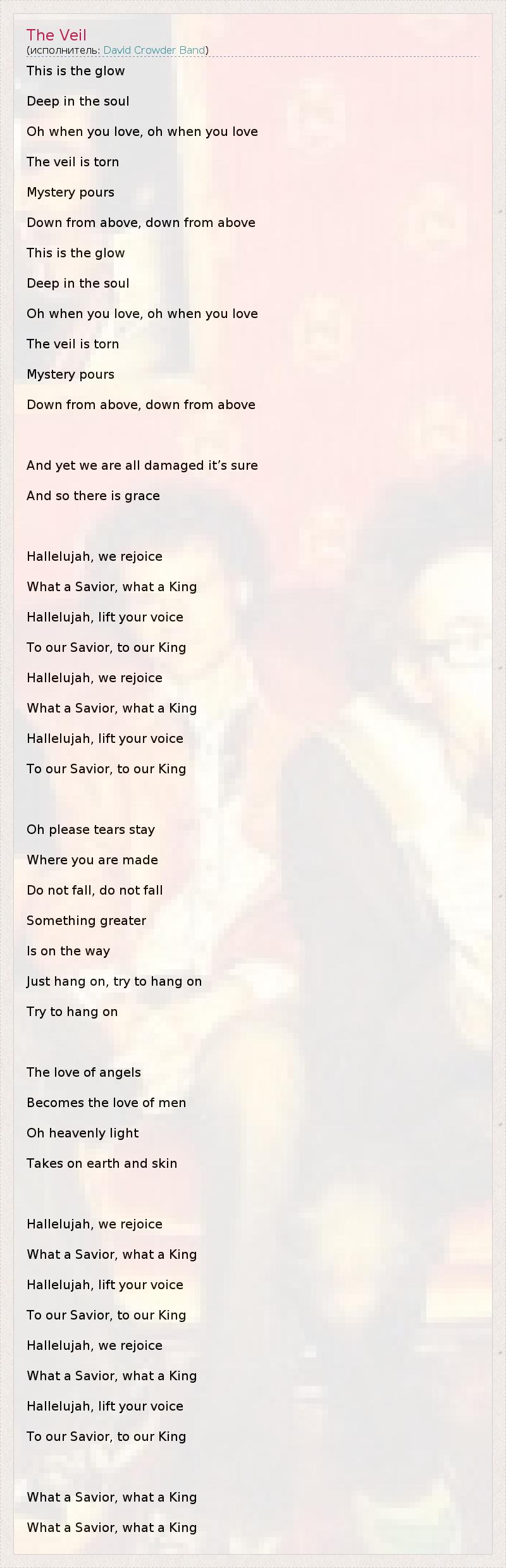 Это интересно:David Crowder Band - это американская христианская рок-группа из города Уэйко (Техас), образованная в конце 90-х годов и состоящая из 6 участников: вокалиста, гитариста и клавишника Дэвида Кроудера (David Crowder), гитариста и бэк-вокалиста Джека Паркера (Jack Parker), басиста и клавишника Майка Додсона (Mike Dodson), виолончелиста и гитариста Майка Хогана (Mike Hogan), барабанщика и перкуссиониста Джереми Буша (Jeremy "B-Wack"... продолжение