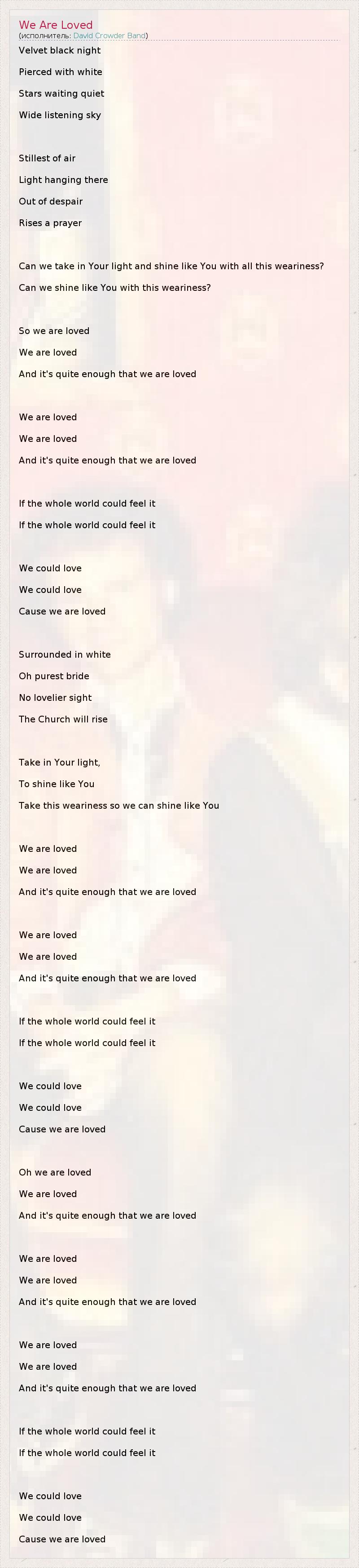 Velvet black night Pierced with white Stars waiting quiet Wide listening sky Stillest of air Light hanging there Out of despair Rises a prayer Can we take in Your light and shine like You with all this weariness? Can we shine like You with this weariness? So we are loved We are loved And it's quite enough that we are loved We are loved We are loved And it's quite enough that we are loved If the whole world could feel it If the whole world could feel it We could love We could love Cause we are loved Surrounded in white Oh purest bride No lovelier sight The Church will rise Take in Your light, To shine like You Take this weariness so we can shine like You We are loved We are loved And it's quite enough that we are loved We are loved We are loved And it's quite enough that we are loved If the whole world could feel it If the whole world could feel it We could love We could love Cause we are loved Oh we are loved We are loved And it's quite enough that we are loved We are loved We are loved And it's quite enough that we are loved We are loved We are loved And it's quite enough that we are loved If the whole world could feel it If the whole world could feel it We could love We could love Cause we are loved