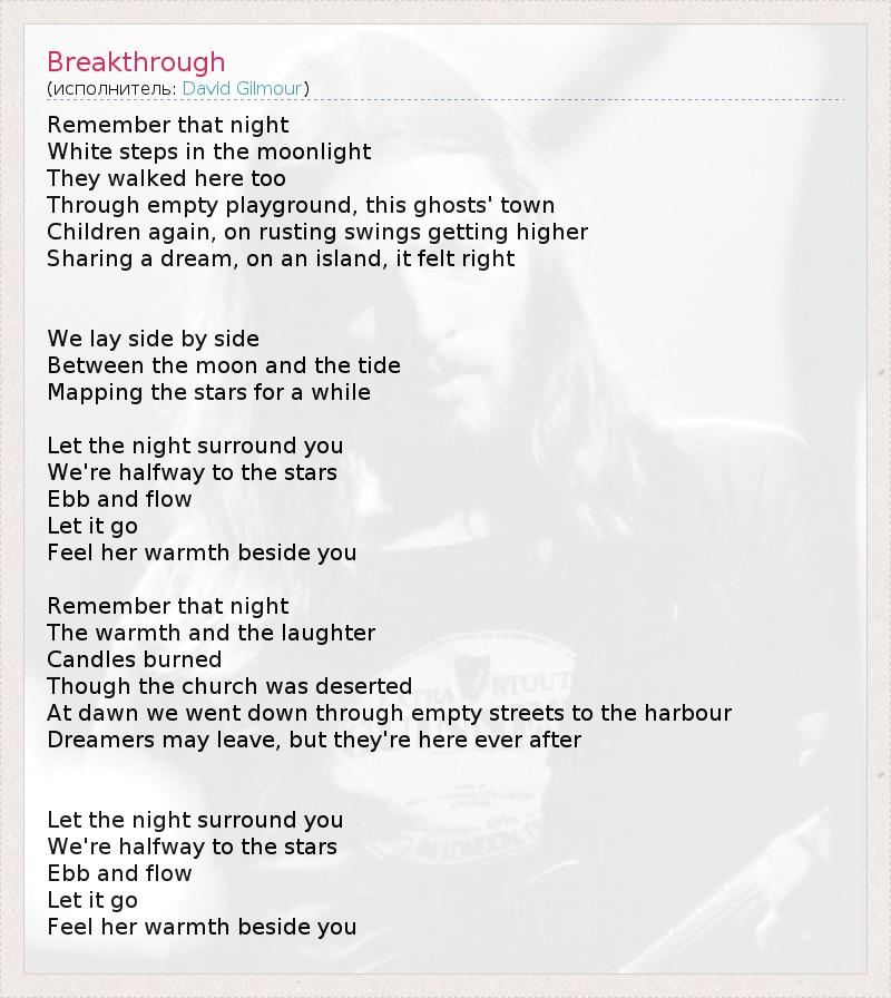 Перевод не мой, взяла отсюда http://pink-floyd.ru/albums/gilmour/island/on_an_island.html