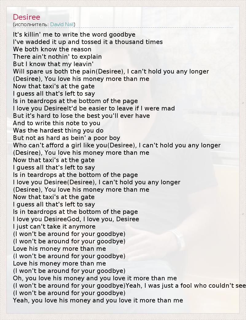 It's killin' me to write the word goodbye I've wadded it up and tossed it a thousand times We both know the reason There ain't nothin' to explain But I know that my leavin' Will spare us both the pain(Desiree), I can't hold you any longer (Desiree), You love his money more than me Now that taxi's at the gate I guess all that's left to say Is in teardrops at the bottom of the page I love you DesireeIt'd be easier to leave if I were mad But it's hard to lose the best you'll ever have And to write this note to you Was the hardest thing you do But not as hard as bein' a poor boy Who can't afford a girl like you(Desiree), I can't hold you any longer (Desiree), You love his money more than me Now that taxi's at the gate I guess all that's left to say Is in teardrops at the bottom of the page I love you Desiree(Desiree), I can't hold you any longer (Desiree), You love his money more than me Now that taxi's at the gate I guess all that's left to say Is in teardrops at the bottom of the page I love you DesireeGod, I love you, Desiree I just can't take it anymore (I won't be around for your goodbye) (I won't be around for your goodbye) Love his money more than me (I won't be around for your goodbye) Love his money more than me (I won't be around for your goodbye) Oh, you love his money and you love it more than me (I won't be around for your goodbye)Yeah, I was just a fool who couldn't see (I won't be around for your goodbye) Yeah, you love his money and you love it more than me
