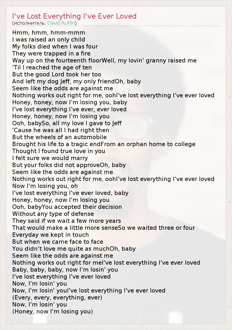 Hmm, hmm, hmm-mmm I was raised an only child My folks died when I was four They were trapped in a fire Way up on the fourteenth floorWell, my lovin' granny raised me 'Til I reached the age of ten But the good Lord took her too And left my dog Jeff, my only friendOh, baby Seem like the odds are against me Nothing works out right for me, oohI've lost everything I've ever loved Honey, honey, now I'm losing you, baby I've lost everything I've ever, ever loved Honey, honey, now I'm losing you Ooh, babySo, all my love I gave to Jeff 'Cause he was all I had right then But the wheels of an automobile Brought his life to a tragic endFrom an orphan home to college Thought I found true love in you I felt sure we would marry But your folks did not approveOh, baby Seem like the odds are against me Nothing works out right for me, oohI've lost everything I've ever loved Now I'm losing you, oh I've lost everything I've ever loved, baby Honey, honey, now I'm losing you Ooh, babyYou accepted their decision Without any type of defense They said if we wait a few more years That would make a little more senseSo we waited three or four Everyday we kept in touch But when we came face to face You didn't love me quite as muchOh, baby Seem like the odds are against me Nothing works out right for meI've lost everything I've ever loved Baby, baby, baby, now I'm losin' you I've lost everything I've ever loved Now, I'm losin' you Now, I'm losin' youI've lost everything I've ever loved (Every, every, everything, ever) Now, I'm losin' you (Honey, now I'm losing you)