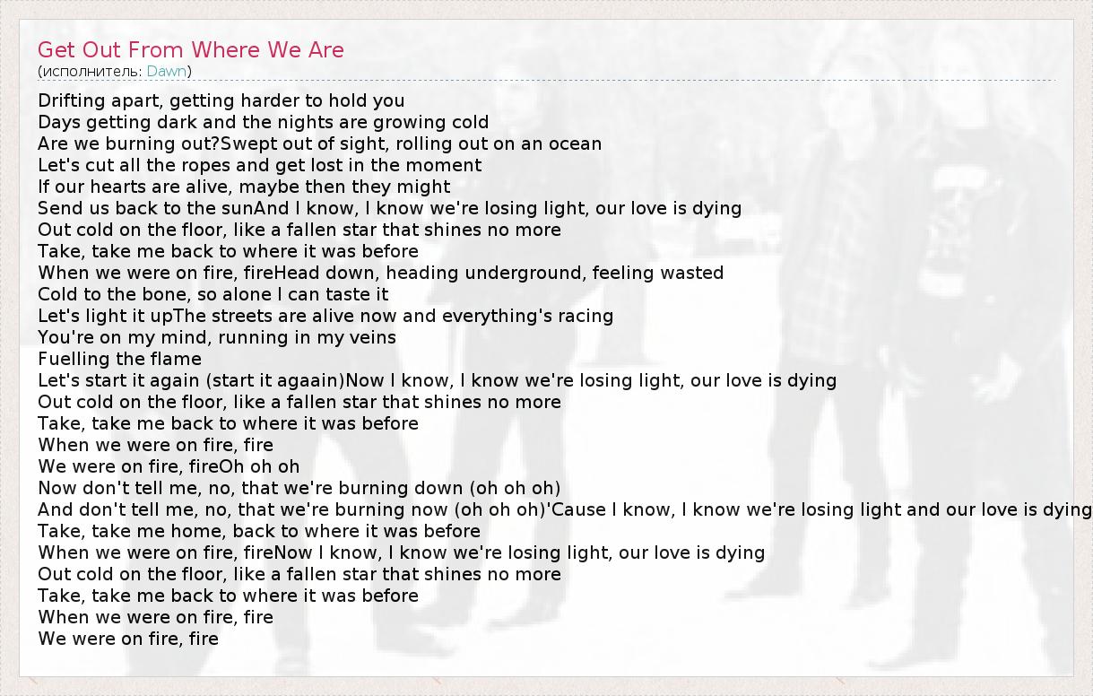 Drifting apart, getting harder to hold you Days getting dark and the nights are growing cold Are we burning out?Swept out of sight, rolling out on an ocean Let's cut all the ropes and get lost in the moment If our hearts are alive, maybe then they might Send us back to the sunAnd I know, I know we're losing light, our love is dying Out cold on the floor, like a fallen star that shines no more Take, take me back to where it was before When we were on fire, fireHead down, heading underground, feeling wasted Cold to the bone, so alone I can taste it Let's light it upThe streets are alive now and everything's racing You're on my mind, running in my veins Fuelling the flame Let's start it again (start it agaain)Now I know, I know we're losing light, our love is dying Out cold on the floor, like a fallen star that shines no more Take, take me back to where it was before When we were on fire, fire We were on fire, fireOh oh oh Now don't tell me, no, that we're burning down (oh oh oh) And don't tell me, no, that we're burning now (oh oh oh)'Cause I know, I know we're losing light and our love is dying Take, take me home, back to where it was before When we were on fire, fireNow I know, I know we're losing light, our love is dying Out cold on the floor, like a fallen star that shines no more Take, take me back to where it was before When we were on fire, fire We were on fire, fire