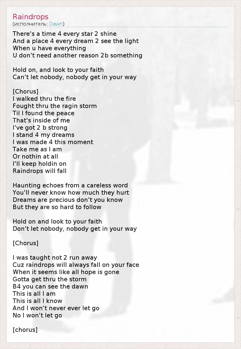 There's a time 4 every star 2 shine And a place 4 every dream 2 see the light When u have everything U don't need another reason 2b something Hold on, and look to your faith Can't let nobody, nobody get in your way [Chorus] I walked thru the fire Fought thru the ragin storm Til I found the peace That's inside of me I've got 2 b strong I stand 4 my dreams I was made 4 this moment Take me as I am Or nothin at all I'll keep holdin on Raindrops will fall Haunting echoes from a careless word You'll never know how much they hurt Dreams are precious don't you know But they are so hard to follow Hold on and look to your faith Don't let nobody, nobody get in your way [Chorus] I was taught not 2 run away Cuz raindrops will always fall on your face When it seems like all hope is gone Gotta get thru the storm B4 you can see the dawn This is all I am This is all I know And I won't never ever let go No I won't let go [chorus]