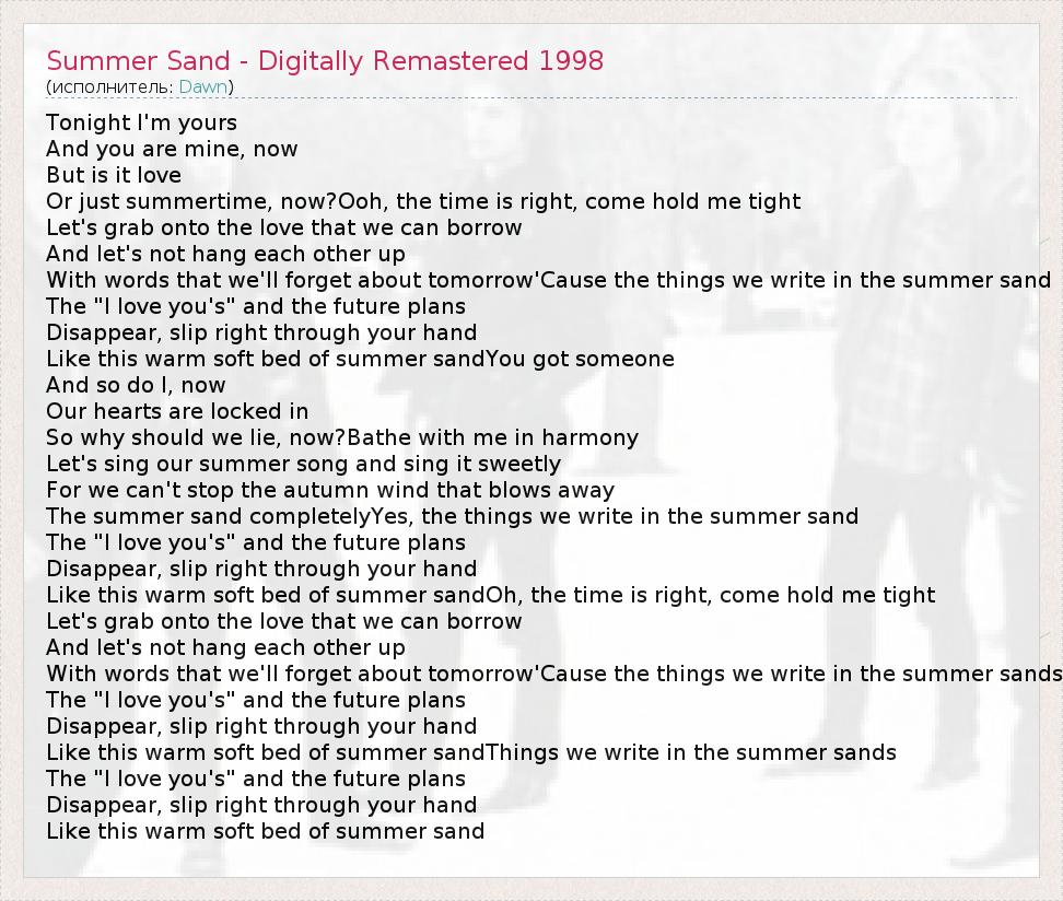 Tonight I'm yours And you are mine, now But is it love Or just summertime, now?Ooh, the time is right, come hold me tight Let's grab onto the love that we can borrow And let's not hang each other up With words that we'll forget about tomorrow'Cause the things we write in the summer sand The "I love you's" and the future plans Disappear, slip right through your hand Like this warm soft bed of summer sandYou got someone And so do I, now Our hearts are locked in So why should we lie, now?Bathe with me in harmony Let's sing our summer song and sing it sweetly For we can't stop the autumn wind that blows away The summer sand completelyYes, the things we write in the summer sand The "I love you's" and the future plans Disappear, slip right through your hand Like this warm soft bed of summer sandOh, the time is right, come hold me tight Let's grab onto the love that we can borrow And let's not hang each other up With words that we'll forget about tomorrow'Cause the things we write in the summer sands The "I love you's" and the future plans Disappear, slip right through your hand Like this warm soft bed of summer sandThings we write in the summer sands The "I love you's" and the future plans Disappear, slip right through your hand Like this warm soft bed of summer sand