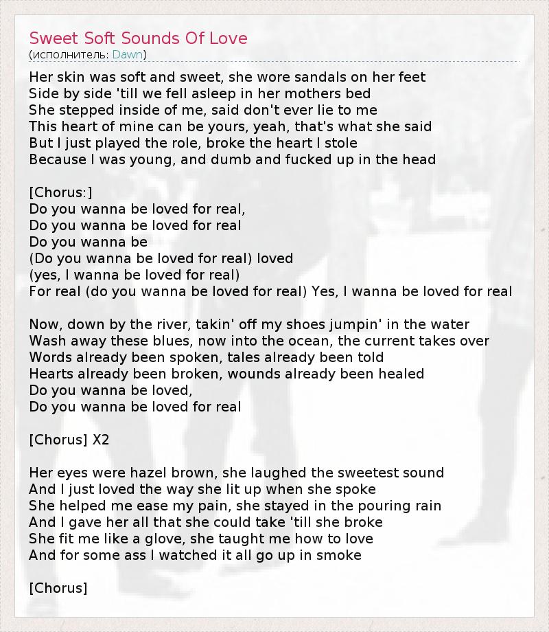 Her skin was soft and sweet, she wore sandals on her feet Side by side 'till we fell asleep in her mothers bed She stepped inside of me, said don't ever lie to me This heart of mine can be yours, yeah, that's what she said But I just played the role, broke the heart I stole Because I was young, and dumb and fucked up in the head [Chorus:] Do you wanna be loved for real, Do you wanna be loved for real Do you wanna be (Do you wanna be loved for real) loved (yes, I wanna be loved for real) For real (do you wanna be loved for real) Yes, I wanna be loved for real Now, down by the river, takin' off my shoes jumpin' in the water Wash away these blues, now into the ocean, the current takes over Words already been spoken, tales already been told Hearts already been broken, wounds already been healed Do you wanna be loved, Do you wanna be loved for real [Chorus] X2 Her eyes were hazel brown, she laughed the sweetest sound And I just loved the way she lit up when she spoke She helped me ease my pain, she stayed in the pouring rain And I gave her all that she could take 'till she broke She fit me like a glove, she taught me how to love And for some ass I watched it all go up in smoke [Chorus]