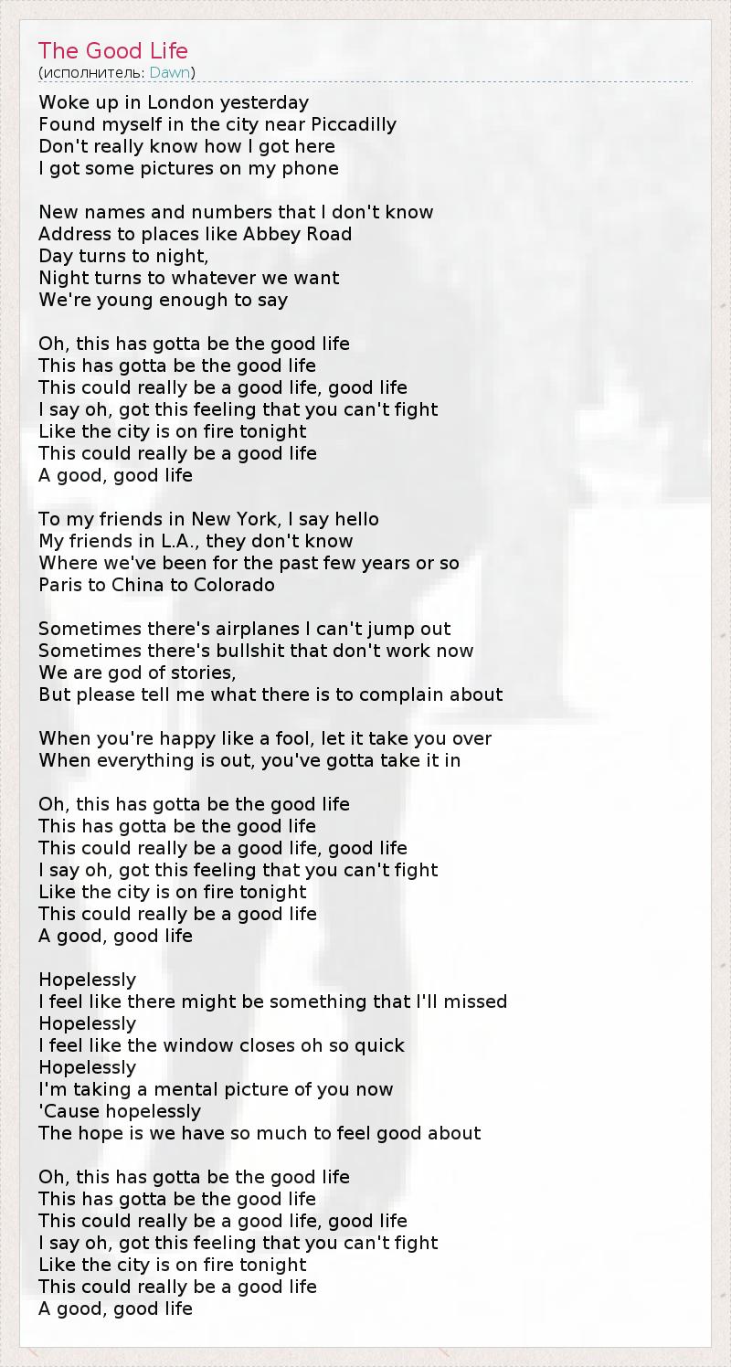 Введите перевод песниВчера проснулся в Лондоне И обнаружил, что я в Сити возле Пикадилли. Не знаю, как я оказался здесь, У меня есть какие-то картинки на телефоне... Новые номера и телефоны, незнакомые мне, Адреса вроде Эбби Роуд... День плавно переходит в ночь, А ночь мы превращаем в то, что угодно нам, Мы достаточно молоды, чтобы сказать... [Припев:] О, Эта жизнь должна быть хороша, Эта жизнь должна быть хороша, Эта жизнь на самом деле могла бы быть хороша! Я говорю, о, Я испытываю чувство, которому невозможно сопротивляться, Словно этот город – одна прекрасная ночь. Эта жизнь и правда могла бы быть хороша, Отличная, отличная жизнь! Ооо, ооо, ооо, ооо... Моим друзьям в Нью-Йорке я говорю «привет», Мои друзья в Лос-Анджелесе, им неизвестно, Где я был пару последних лет или около того, Из Парижа в Китай и в Колорадо! Из некоторых самолётов мне не выпрыгнуть, Иногда случается ерунда, которая не срабатывает. У нас есть что рассказать, так пожалуйста, скажи мне-е-е, На что же можно жаловаться? Когда ты счастлив, как дурачок, Пусть радость охватит тебя целиком, Когда всё уже пропало, Ты соберешь его обратно. [Припев:] О, Эта жизнь должна быть хороша, Эта жизнь должна быть хороша, Эта жизнь на самом деле могла бы быть хороша! Я говорю, о, Я испытываю чувство, которому невозможно сопротивляться, Словно этот город – одна прекрасная ночь. Эта жизнь и правда могла бы быть хороша, Отличная, отличная жизнь! Ооо, ооо, ооо, ооо... О, классная, классная жизнь, Прошу, о, да, ооо... Пришло безнадёжное чувство, что я мог нечто упустить, Пришло безнадёжное чувство, что окно так быстро закрывается... Я безнадёжно представляю тебя в мыслях, Потому что безнадёжно думаю: надежда доставляет нам приятные ощущения. [Припев:] О, Эта жизнь должна быть хороша, Эта жизнь должна быть хороша, Эта жизнь на самом деле могла бы быть хороша! О, Я испытываю чувство, которому невозможно сопротивляться, Словно этот город – одна прекрасная ночь. Эта жизнь и правда могла бы быть хороша, Отличная, отличная жизнь! О, да, Классная, классная жизнь, Классная жизнь Ооо, ооо, ооо, ооо… Слушайте! Моим друзьям в Нью-Йорке я говорю «привет», Мои друзья в Лос-Анджелесе, им неизвестно, Где я был пару последних лет или около того, Из Парижа в Китай и в Колорадо! Из некоторых самолётов мне не выпрыгнуть, Иногда случается ерунда, которая не срабатывает. У нас есть что рассказать, так пожалуйста, скажи мне-е-е, На что же можно жаловаться?