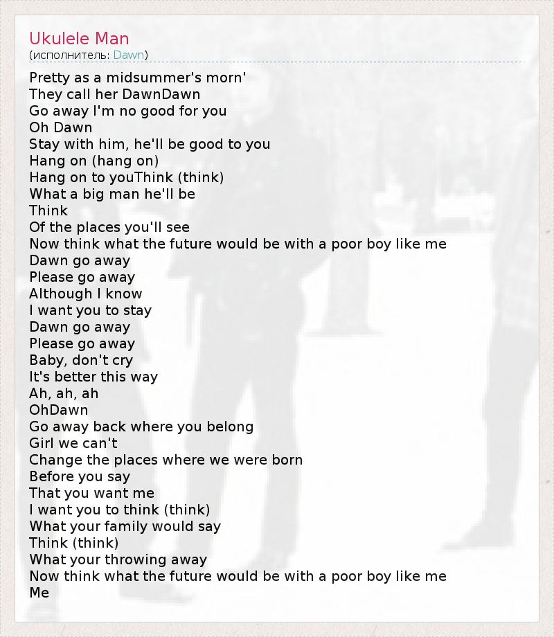 Pretty as a midsummer's morn' They call her DawnDawn Go away I'm no good for you Oh Dawn Stay with him, he'll be good to you Hang on (hang on) Hang on to youThink (think) What a big man he'll be Think Of the places you'll see Now think what the future would be with a poor boy like me Dawn go away Please go away Although I know I want you to stay Dawn go away Please go away Baby, don't cry It's better this way Ah, ah, ah OhDawn Go away back where you belong Girl we can't Change the places where we were born Before you say That you want me I want you to think (think) What your family would say Think (think) What your throwing away Now think what the future would be with a poor boy like me Me