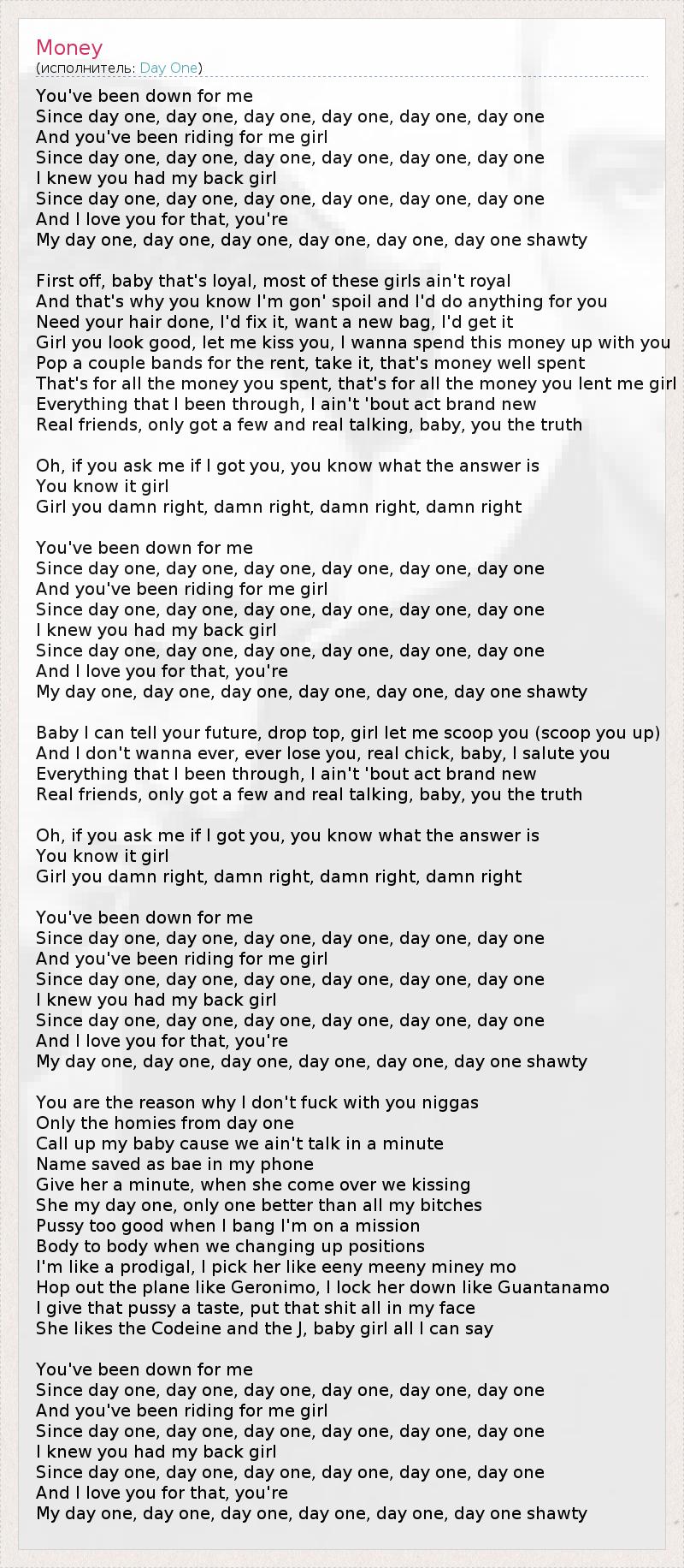 You've been down for me Since day one, day one, day one, day one, day one, day one And you've been riding for me girl Since day one, day one, day one, day one, day one, day one I knew you had my back girl Since day one, day one, day one, day one, day one, day one And I love you for that, you're My day one, day one, day one, day one, day one, day one shawty First off, baby that's loyal, most of these girls ain't royal And that's why you know I'm gon' spoil and I'd do anything for you Need your hair done, I'd fix it, want a new bag, I'd get it Girl you look good, let me kiss you, I wanna spend this money up with you Pop a couple bands for the rent, take it, that's money well spent That's for all the money you spent, that's for all the money you lent me girl Everything that I been through, I ain't 'bout act brand new Real friends, only got a few and real talking, baby, you the truth Oh, if you ask me if I got you, you know what the answer is You know it girl Girl you damn right, damn right, damn right, damn right You've been down for me Since day one, day one, day one, day one, day one, day one And you've been riding for me girl Since day one, day one, day one, day one, day one, day one I knew you had my back girl Since day one, day one, day one, day one, day one, day one And I love you for that, you're My day one, day one, day one, day one, day one, day one shawty Baby I can tell your future, drop top, girl let me scoop you (scoop you up) And I don't wanna ever, ever lose you, real chick, baby, I salute you Everything that I been through, I ain't 'bout act brand new Real friends, only got a few and real talking, baby, you the truth Oh, if you ask me if I got you, you know what the answer is You know it girl Girl you damn right, damn right, damn right, damn right You've been down for me Since day one, day one, day one, day one, day one, day one And you've been riding for me girl Since day one, day one, day one, day one, day one, day one I knew you had my back girl Since day one, day one, day one, day one, day one, day one And I love you for that, you're My day one, day one, day one, day one, day one, day one shawty You are the reason why I don't fuck with you niggas Only the homies from day one Call up my baby cause we ain't talk in a minute Name saved as bae in my phone Give her a minute, when she come over we kissing She my day one, only one better than all my bitches Pussy too good when I bang I'm on a mission Body to body when we changing up positions I'm like a prodigal, I pick her like eeny meeny miney mo Hop out the plane like Geronimo, I lock her down like Guantanamo I give that pussy a taste, put that shit all in my face She likes the Codeine and the J, baby girl all I can say You've been down for me Since day one, day one, day one, day one, day one, day one And you've been riding for me girl Since day one, day one, day one, day one, day one, day one I knew you had my back girl Since day one, day one, day one, day one, day one, day one And I love you for that, you're My day one, day one, day one, day one, day one, day one shawty