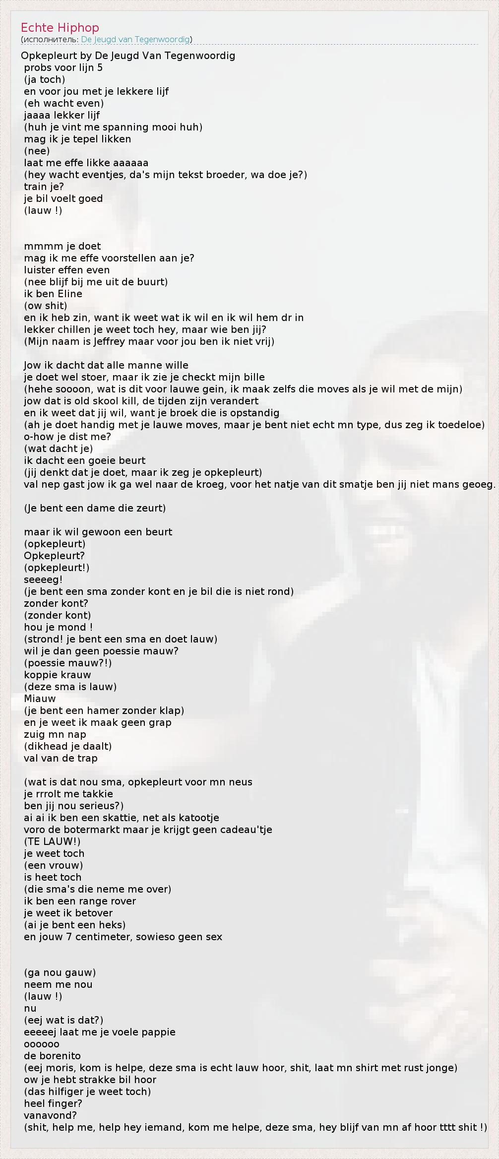Opkepleurt by De Jeugd Van Tegenwoordig probs voor lijn 5 (ja toch) en voor jou met je lekkere lijf (eh wacht even) jaaaa lekker lijf (huh je vint me spanning mooi huh) mag ik je tepel likken (nee) laat me effe likke aaaaaa (hey wacht eventjes, da's mijn tekst broeder, wa doe je?) train je? je bil voelt goed (lauw !) mmmm je doet mag ik me effe voorstellen aan je? luister effen even (nee blijf bij me uit de buurt) ik ben Eline (ow shit) en ik heb zin, want ik weet wat ik wil en ik wil hem dr in lekker chillen je weet toch hey, maar wie ben jij? (Mijn naam is Jeffrey maar voor jou ben ik niet vrij) Jow ik dacht dat alle manne wille je doet wel stoer, maar ik zie je checkt mijn bille (hehe soooon, wat is dit voor lauwe gein, ik maak zelfs die moves als je wil met de mijn) jow dat is old skool kill, de tijden zijn verandert en ik weet dat jij wil, want je broek die is opstandig (ah je doet handig met je lauwe moves, maar je bent niet echt mn type, dus zeg ik toedeloe) o-how je dist me? (wat dacht je) ik dacht een goeie beurt (jij denkt dat je doet, maar ik zeg je opkepleurt) val nep gast jow ik ga wel naar de kroeg, voor het natje van dit smatje ben jij niet mans geoeg. (Je bent een dame die zeurt) maar ik wil gewoon een beurt (opkepleurt) Opkepleurt? (opkepleurt!) seeeeg! (je bent een sma zonder kont en je bil die is niet rond) zonder kont? (zonder kont) hou je mond ! (strond! je bent een sma en doet lauw) wil je dan geen poessie mauw? (poessie mauw?!) koppie krauw (deze sma is lauw) Miauw (je bent een hamer zonder klap) en je weet ik maak geen grap zuig mn nap (dikhead je daalt) val van de trap (wat is dat nou sma, opkepleurt voor mn neus je rrrolt me takkie ben jij nou serieus?) ai ai ik ben een skattie, net als katootje voro de botermarkt maar je krijgt geen cadeau'tje (TE LAUW!) je weet toch (een vrouw) is heet toch (die sma's die neme me over) ik ben een range rover je weet ik betover (ai je bent een heks) en jouw 7 centimeter, sowieso geen sex (ga nou gauw) neem me nou (lauw !) nu (eej wat is dat?) eeeeej laat me je voele pappie oooooo de borenito (eej moris, kom is helpe, deze sma is echt lauw hoor, shit, laat mn shirt met rust jonge) ow je hebt strakke bil hoor (das hilfiger je weet toch) heel finger? vanavond? (shit, help me, help hey iemand, kom me helpe, deze sma, hey blijf van mn af hoor tttt shit !)