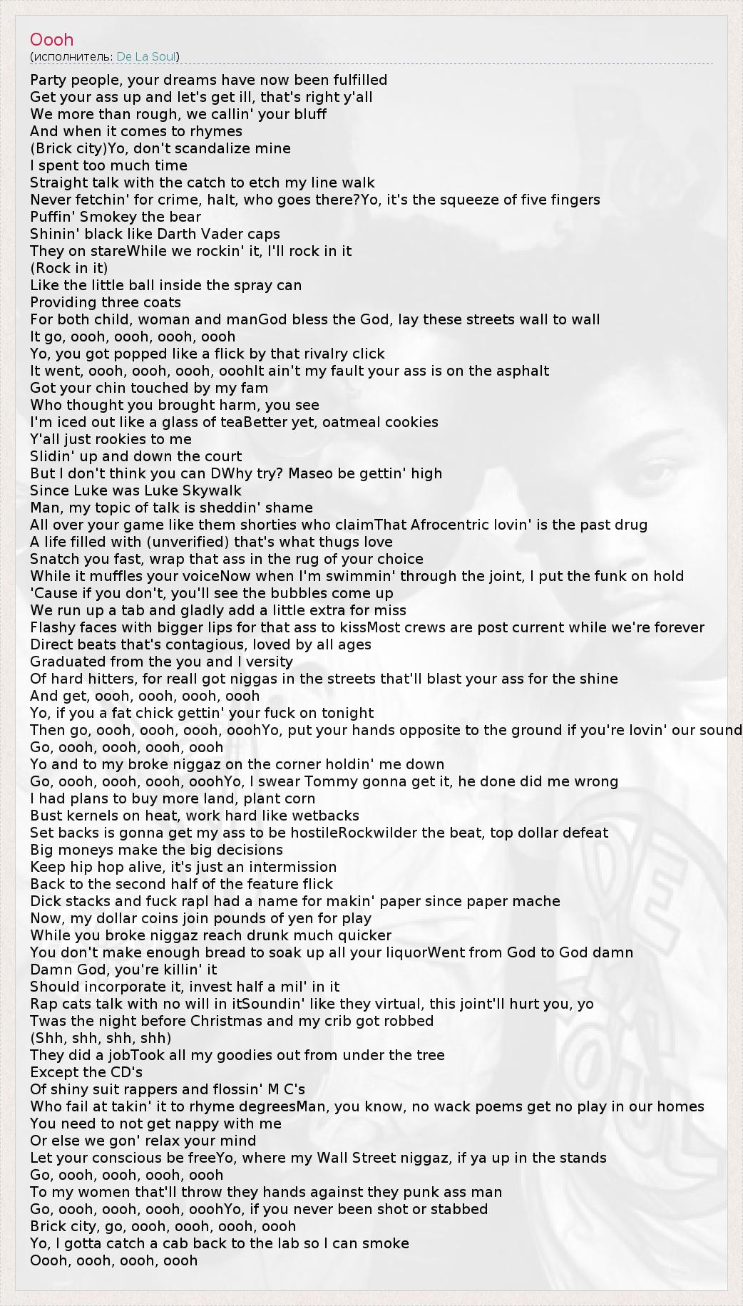 Это интересно:Благодаря участию в восхитительном сингле "Feel Good Inc" английского мультяшного ансамбля Gorillaz, американские хип-хоперы De La Soul снова в центре внимания. И даже те, кто ничего о них не слышал, набирают это название в поисковиках. А те, кто преклоняется перед этими людьми со времен их альбома "3 Feet High And Rising", удовлетворенно покачивают головами – ветераны получили второй... продолжение
