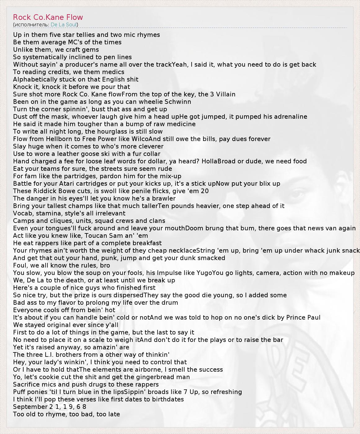 Up in them five star tellies and two mic rhymes Be them average MC's of the times Unlike them, we craft gems So systematically inclined to pen lines Without sayin' a producer's name all over the trackYeah, I said it, what you need to do is get back To reading credits, we them medics Alphabetically stuck on that English shit Knock it, knock it before we pour that Sure shot more Rock Co. Kane flowFrom the top of the key, the 3 Villain Been on in the game as long as you can wheelie Schwinn Turn the corner spinnin', bust that ass and get up Dust off the mask, whoever laugh give him a head upHe got jumped, it pumped his adrenaline He said it made him tougher than a bump of raw medicine To write all night long, the hourglass is still slow Flow from Hellborn to Free Power like WilcoAnd still owe the bills, pay dues forever Slay huge when it comes to who's more cleverer Use to wore a leather goose ski with a fur collar Hand charged a fee for loose leaf words for dollar, ya heard? HollaBroad or dude, we need food Eat your teams for sure, the streets sure seem rude For fam like the partridges, pardon him for the mix-up Battle for your Atari cartridges or put your kicks up, it's a stick upNow put your blix up These Riddick Bowe cuts, is swoll like penile flicks, give 'em 20 The danger in his eyes'll let you know he's a brawler Bring your tallest champs like that much tallerTen pounds heavier, one step ahead of it Vocab, stamina, style's all irrelevant Camps and cliques, units, squad crews and clans Even your tongues'll fuck around and leave your mouthDoom brung that bum, there goes that news van again Act like you knew like, Toucan Sam an' 'em He eat rappers like part of a complete breakfast Your rhymes ain't worth the weight of they cheap necklaceString 'em up, bring 'em up under whack junk snack And get that out your hand, punk, jump and get your dunk smacked Foul, we all know the rules, bro You slow, you blow the soup on your fools, his Impulse like YugoYou go lights, camera, action with no makeup We, De La to the death, or at least until we break up Here's a couple of nice guys who finished first So nice try, but the prize is ours dispersedThey say the good die young, so I added some Bad ass to my flavor to prolong my life over the drum Everyone cools off from bein' hot It's about if you can handle bein' cold or notAnd we was told to hop on no one's dick by Prince Paul We stayed original ever since y'all First to do a lot of things in the game, but the last to say it No need to place it on a scale to weigh itAnd don't do it for the plays or to raise the bar Yet it's raised anyway, so amazin' are The three L.I. brothers from a other way of thinkin' Hey, your lady's winkin', I think you need to control that Or I have to hold thatThe elements are airborne, I smell the success Yo, let's cookie cut the shit and get the gingerbread man Sacrifice mics and push drugs to these rappers Puff ponies 'til I turn blue in the lipsSippin' broads like 7 Up, so refreshing I think I'll pop these verses like first dates to birthdates September 2 1, 1 9, 6 8 Too old to rhyme, too bad, too late