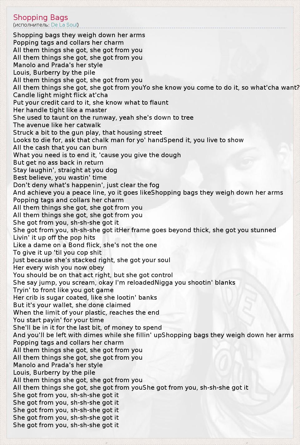 А как ты думаешь, о чем песня "Shopping Bags" ?