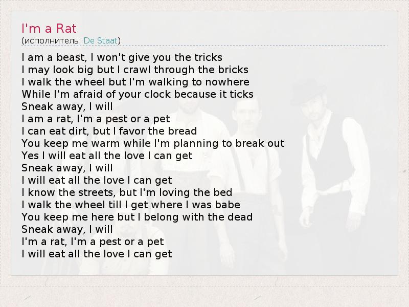 I am a beast, I won't give you the tricks I may look big but I crawl through the bricks I walk the wheel but I'm walking to nowhere While I'm afraid of your clock because it ticks Sneak away, I will I am a rat, I'm a pest or a pet I can eat dirt, but I favor the bread You keep me warm while I'm planning to break out Yes I will eat all the love I can get Sneak away, I will I will eat all the love I can get I know the streets, but I'm loving the bed I walk the wheel till I get where I was babe You keep me here but I belong with the dead Sneak away, I will I'm a rat, I'm a pest or a pet I will eat all the love I can get
