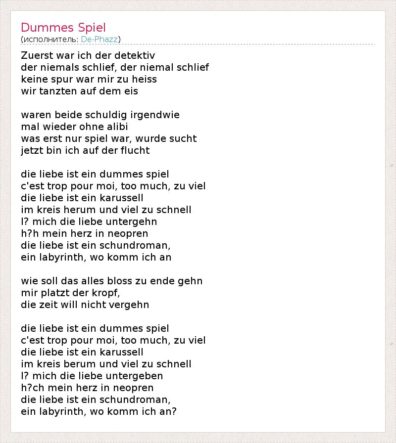 Zuerst war ich der detektiv der niemals schlief, der niemal schlief keine spur war mir zu heiss wir tanzten auf dem eis waren beide schuldig irgendwie mal wieder ohne alibi was erst nur spiel war, wurde sucht jetzt bin ich auf der flucht die liebe ist ein dummes spiel c'est trop pour moi, too much, zu viel die liebe ist ein karussell im kreis herum und viel zu schnell l? mich die liebe untergehn h?h mein herz in neopren die liebe ist ein schundroman, ein labyrinth, wo komm ich an wie soll das alles bloss zu ende gehn mir platzt der kropf, die zeit will nicht vergehn die liebe ist ein dummes spiel c'est trop pour moi, too much, zu viel die liebe ist ein karussell im kreis berum und viel zu schnell l? mich die liebe untergeben h?ch mein herz in neopren die liebe ist ein schundroman, ein labyrinth, wo komm ich an?