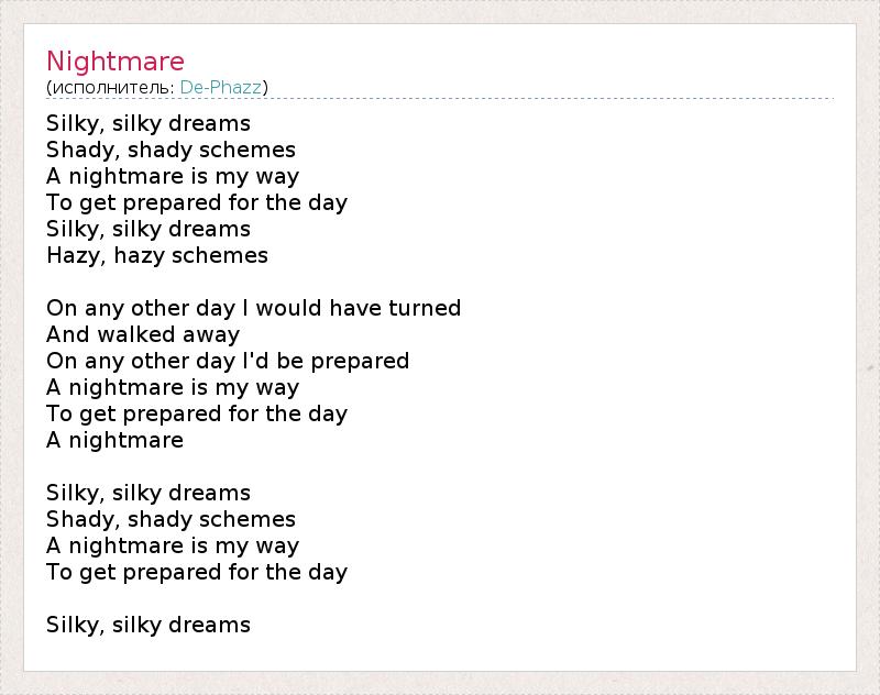 Silky, silky dreams Shady, shady schemes A nightmare is my way To get prepared for the day Silky, silky dreams Hazy, hazy schemes On any other day I would have turned And walked away On any other day I'd be prepared A nightmare is my way To get prepared for the day A nightmare Silky, silky dreams Shady, shady schemes A nightmare is my way To get prepared for the day Silky, silky dreams