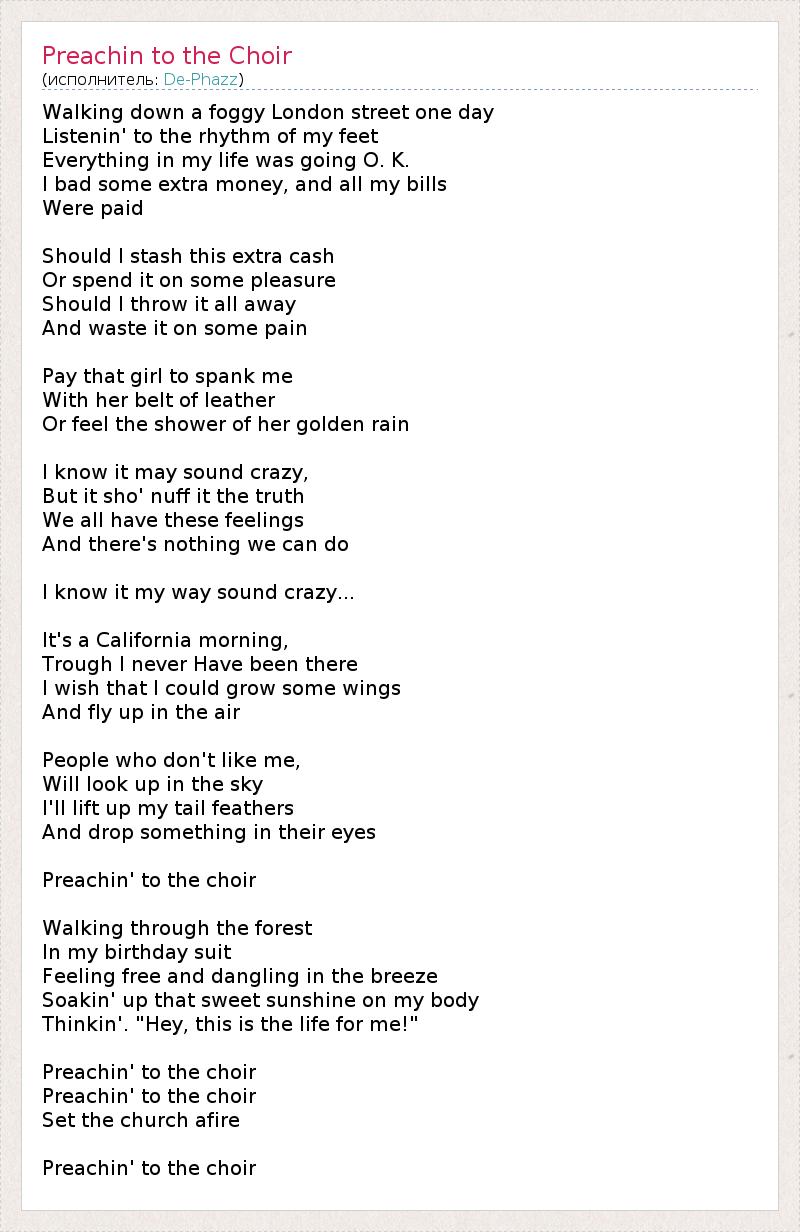 Walking down a foggy London street one day Listenin' to the rhythm of my feet Everything in my life was going O. K. I bad some extra money, and all my bills Were paid Should I stash this extra cash Or spend it on some pleasure Should I throw it all away And waste it on some pain Pay that girl to spank me With her belt of leather Or feel the shower of her golden rain I know it may sound crazy, But it sho' nuff it the truth We all have these feelings And there's nothing we can do I know it my way sound crazy... It's a California morning, Trough I never Have been there I wish that I could grow some wings And fly up in the air People who don't like me, Will look up in the sky I'll lift up my tail feathers And drop something in their eyes Preachin' to the choir Walking through the forest In my birthday suit Feeling free and dangling in the breeze Soakin' up that sweet sunshine on my body Thinkin'. "Hey, this is the life for me!" Preachin' to the choir Preachin' to the choir Set the church afire Preachin' to the choir
