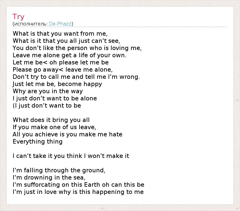 What is that you want from me, What is it that you all just can't see, You don't like the person who is loving me, Leave me alone get a life of your own. Let me be< oh please let me be Please go away< leave me alone, Don't try to call me and tell me I'm wrong. Just let me be, become happy Why are you in the way I just don't want to be alone (I just don't want to be What does it bring you all If you make one of us leave, All you achieve is you make me hate Everything thing I can't take it you think I won't make it I'm falling through the ground, I'm drowning in the sea, I'm sufforcating on this Earth oh can this be I'm just in love why is this happening to me
