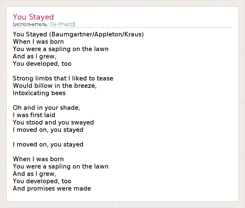 Вы Останавливались ( Баумгартнер / Эпплтон / Краус ) Когда я родился Вы были деревце на лужайке И , как я рос , Вы разработали , слишком Сильные конечности , которые я любил дразнить Вздыматься бы на ветру , Пьянящий пчелы Ох, и в вашем тени , Я впервые был заложен Вы стояли и вы качались Я пошел дальше, вы остались Я пошел дальше, вы остались Когда я родился Вы были деревце на лужайке И , как я рос , Вы разработали , слишком И были сделаны обещания