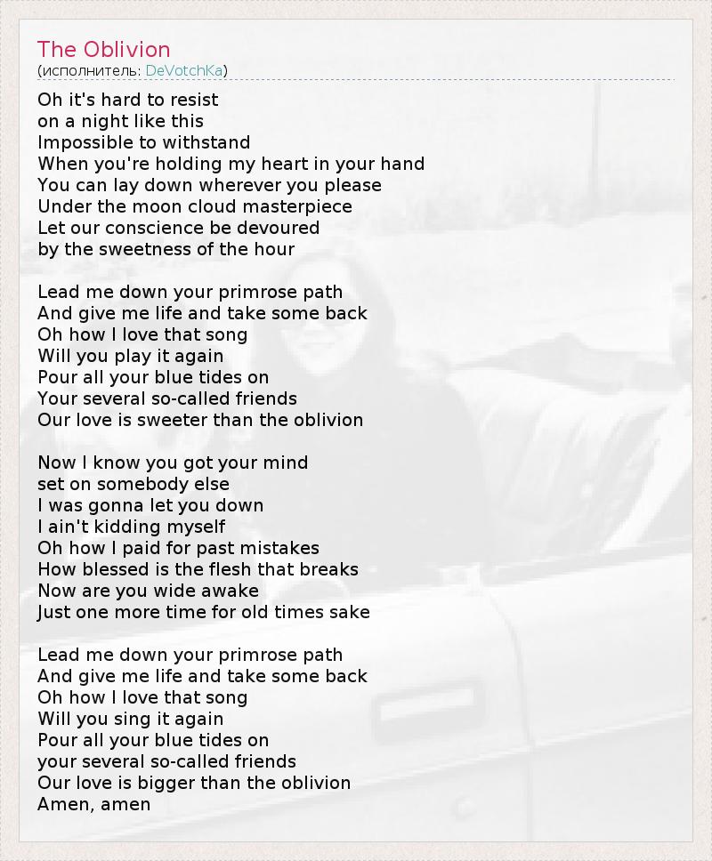 Oh it's hard to resist on a night like this Impossible to withstand When you're holding my heart in your hand You can lay down wherever you please Under the moon cloud masterpiece Let our conscience be devoured by the sweetness of the hour Lead me down your primrose path And give me life and take some back Oh how I love that song Will you play it again Pour all your blue tides on Your several so-called friends Our love is sweeter than the oblivion Now I know you got your mind set on somebody else I was gonna let you down I ain't kidding myself Oh how I paid for past mistakes How blessed is the flesh that breaks Now are you wide awake Just one more time for old times sake Lead me down your primrose path And give me life and take some back Oh how I love that song Will you sing it again Pour all your blue tides on your several so-called friends Our love is bigger than the oblivion Amen, amen
