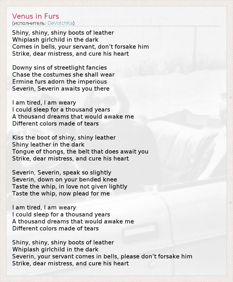 Ботинки из сияющей кожи, Отхлестай девочку в темноте. Со звоном приходит твой слуга - не прогоняй его; Ударь, госпожа, исцели его сердце. Греховные мечтания уличных фонарей... Отбрось в сторону костюм, который она должна была надеть. Властность в наряде из мехов горностая - Северин, Северин ждет тебя там. Я устал, я утомлен, Я бы мог проспать тысячу лет... Тысячи снов - кто бы разбудил меня? Тысячи цветов, переливающихся, словно слезы. Сияющие кожаные ботинки, Кожа, сверкающая в темноте, Язык ожидающего тебя кнута... Ударь, госпожа, исцели его сердце. Северин, Северин, ты так немногословен... На колени, Северин! Испытай кнут, любимый, Испытай кнут, умоляй меня... Я устал, я утомлен, Я бы мог проспать тысячу лет... Тысячи снов - кто бы разбудил меня? Тысячи цветов, переливающихся, словно слезы. Ботинки из сияющей кожи, Отхлестай девочку в темноте. Со звоном приходит твой слуга, Северин - пожалуйста, не прогоняй его; Ударь, госпожа, исцели его сердце. *песня основана на романе Леопольда фон Захер-Мазоха «Венера в мехах», посвященном теме садомазохизма.