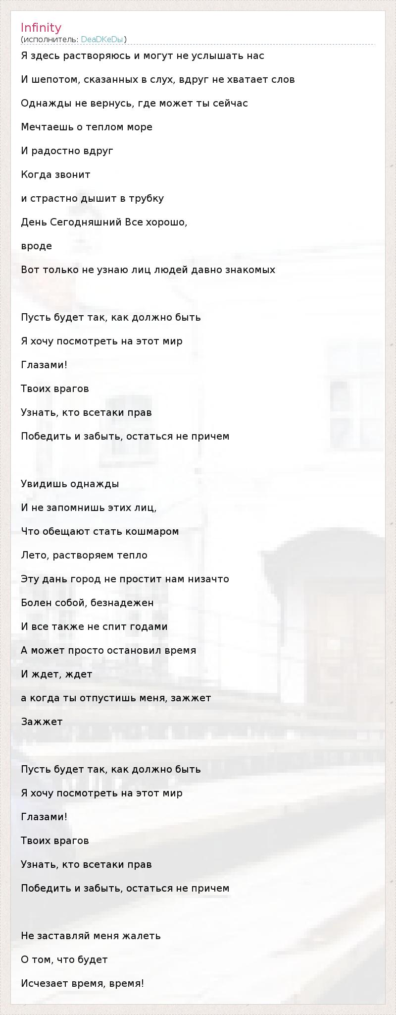 Я здесь растворяюсь и могут не услышать нас И шепотом, сказанных в слух, вдруг не хватает слов Однажды не вернусь, где может ты сейчас Мечтаешь о теплом море И радостно вдруг Когда звонит и страстно дышит в трубку День Сегодняшний Все хорошо, вроде Вот только не узнаю лиц людей давно знакомых Пусть будет так, как должно быть Я хочу посмотреть на этот мир Глазами! Твоих врагов Узнать, кто всетаки прав Победить и забыть, остаться не причем Увидишь однажды И не запомнишь этих лиц, Что обещают стать кошмаром Лето, растворяем тепло Эту дань город не простит нам низачто Болен собой, безнадежен И все также не спит годами А может просто остановил время И ждет, ждет а когда ты отпустишь меня, зажжет Зажжет Пусть будет так, как должно быть Я хочу посмотреть на этот мир Глазами! Твоих врагов Узнать, кто всетаки прав Победить и забыть, остаться не причем Не заставляй меня жалеть О том, что будет Исчезает время, время!