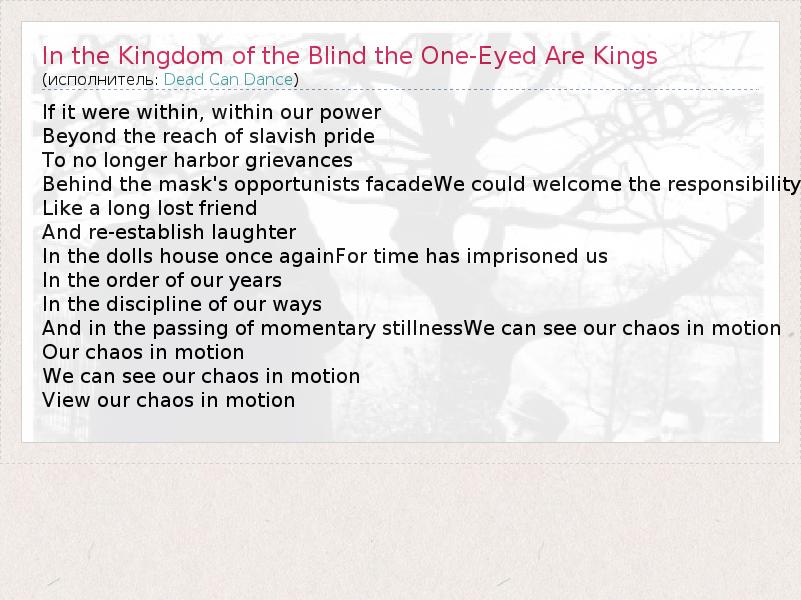 А как ты думаешь, о чем песня "In the Kingdom of the Blind the One-Eyed Are Kings" ?