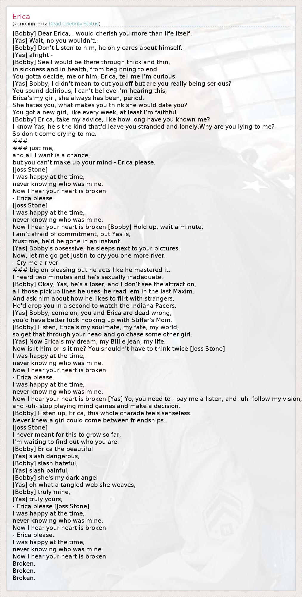 [Bobby] Dear Erica, I would cherish you more than life itself. [Yas] Wait, no you wouldn't.- [Bobby] Don't Listen to him, he only cares about himself.- [Yas] alright - [Bobby] See I would be there through thick and thin, in sickness and in health, from beginning to end. You gotta decide, me or him, Erica, tell me I'm curious. [Yas] Bobby, I didn't mean to cut you off but are you really being serious? You sound delirious, I can't believe I'm hearing this, Erica's my girl, she always has been, period. She hates you, what makes you think she would date you? You got a new girl, like every week, at least I'm faithful. [Bobby] Erica, take my advice, like how long have you known me? I know Yas, he's the kind that'd leave you stranded and lonely.Why are you lying to me? So don't come crying to me. ### ### just me, and all I want is a chance, but you can't make up your mind.- Erica please. [Joss Stone] I was happy at the time, never knowing who was mine. Now I hear your heart is broken. - Erica please. [Joss Stone] I was happy at the time, never knowing who was mine. Now I hear your heart is broken.[Bobby] Hold up, wait a minute, I ain't afraid of commitment, but Yas is, trust me, he'd be gone in an instant. [Yas] Bobby's obsessive, he sleeps next to your pictures. Now, let me go get Justin to cry you one more river. - Cry me a river. ### big on pleasing but he acts like he mastered it. I heard two minutes and he's sexually inadequate. [Bobby] Okay, Yas, he's a loser, and I don't see the attraction, all those pickup lines he uses, he read 'em in the last Maxim. And ask him about how he likes to flirt with strangers. He'd drop you in a second to watch the Indiana Pacers. [Yas] Bobby, come on, you and Erica are dead wrong, you'd have better luck hooking up with Stifler's Mom. [Bobby] Listen, Erica's my soulmate, my fate, my world, so get that through your head and go chase some other girl. [Yas] Now Erica's my dream, my Billie Jean, my life. Now is it him or is it me? You shouldn't have to think twice.[Joss Stone] I was happy at the time, never knowing who was mine. Now I hear your heart is broken. - Erica please. I was happy at the time, never knowing who was mine. Now I hear your heart is broken.[Yas] Yo, you need to - pay me a listen, and -uh- follow my vision, and -uh- stop playing mind games and make a decision. [Bobby] Listen up, Erica, this whole charade feels senseless. Never knew a girl could come between friendships. [Joss Stone] I never meant for this to grow so far, I'm waiting to find out who you are. [Bobby] Erica the beautiful [Yas] slash dangerous, [Bobby] slash hateful, [Yas] slash painful, [Bobby] she's my dark angel [Yas] oh what a tangled web she weaves, [Bobby] truly mine, [Yas] truly yours, - Erica please.[Joss Stone] I was happy at the time, never knowing who was mine. Now I hear your heart is broken. - Erica please. I was happy at the time, never knowing who was mine. Now I hear your heart is broken. Broken. Broken. Broken.