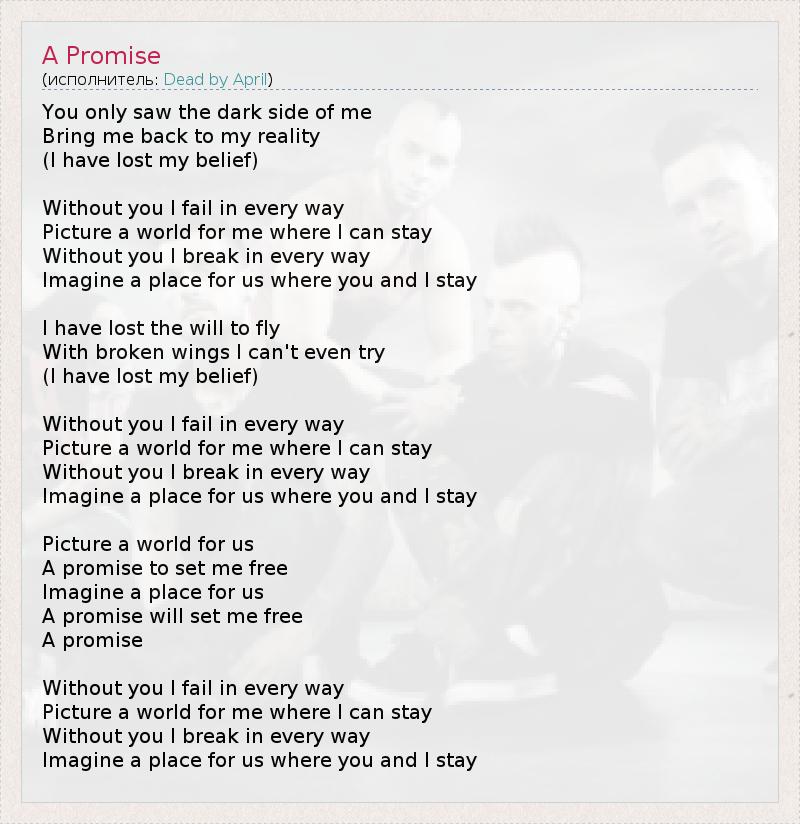 Ты видела лишь мою худшую сторону. Верни меня к реальности, (Я потерял свою веру) Без тебя я никто, Нарисуй мне мир, в котором я смогу жить. Без тебя я сломан, Придумай нам место, в котором мы сможем жить... Я потерял желание летать - Со сломанными крыльями не стоит даже пытаться.... (Я потерял веру) Без тебя я никто, Нарисуй мне мир, в котором я смогу жить. Без тебя я сломан, Придумай нам место, в котором мы сможем жить... Нарисуй нам мир, Обещание подарить мне свободу. Придумай место, Обещание освободит меня. Обещание.... Без тебя я никто, Нарисуй мне мир, в котором я смогу жить. Без тебя я сломан, Придумай нам место, в котором мы сможем жить...