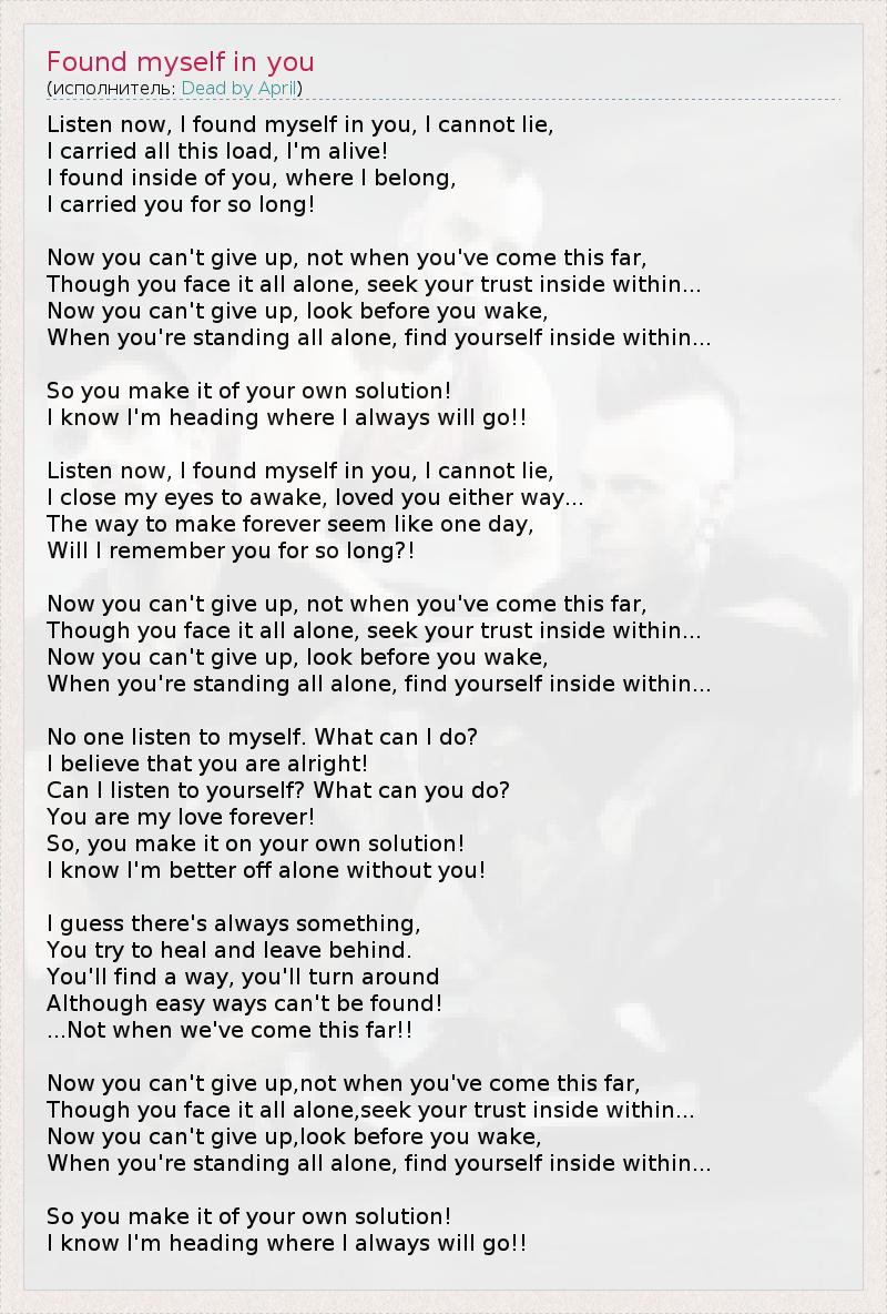 Слушай, я нашел себя в тебе, не могу лгать. Я справился с этой ношей, я жив! Я понял, что моё место в твоей душе, Я так долго влёк тебя за собой! Теперь ты не можешь сдаться, только не сейчас, когда ты зашла так далеко. Хотя ты сталкиваешься с этим одна, ищи свое доверие внутри... Теперь ты не можешь сдаться, посмотри перед тем, как проснуться, Когда ты стоишь в полном одиночестве, ищи себя внутри... Ты делаешь это из собственных побуждений! Я знаю, что направляюсь туда, куда я всегда буду идти! Слушай, я нашел себя в тебе, не могу лгать. Я закрываю глаза, чтобы проснуться, так или иначе я любил тебя... Это путь - сделать вечность одним днем, Буду ли я помнить тебя так долго? Теперь ты не можешь сдаться, только не сейчас, когда ты зашла так далеко. Хотя ты сталкиваешься с этим одна, ищи свое доверие внутри... Теперь ты не можешь сдаться, посмотри перед тем, как проснуться, Когда ты стоишь в полном одиночестве, ищи себя внутри... Меня никто не слушает. Что я могу сделать? Думаю, с тобой все в порядке! Могу ли я слушать тебя? Что ты можешь сделать? Ты - моя любовь навеки! Так прими это решение сама! Я знаю, мне будет лучше одному без тебя! Думаю, всегда есть что-то, Что ты пытаешься излечить и оставить позади. Ты найдёшь путь, ты вернёшься, Хотя легких путей не найти, ...не сейчас, когда мы зашли так далеко... Теперь ты не можешь сдаться, только не сейчас, когда ты зашла так далеко. Хотя ты сталкиваешься с этим одна, ищи свое доверие внутри... Теперь ты не можешь сдаться, посмотри перед тем, как проснуться, Когда ты стоишь в полном одиночестве, ищи себя внутри... Ты делаешь это из собственных побуждений! Я знаю, что направляюсь туда, куда я всегда буду идти!