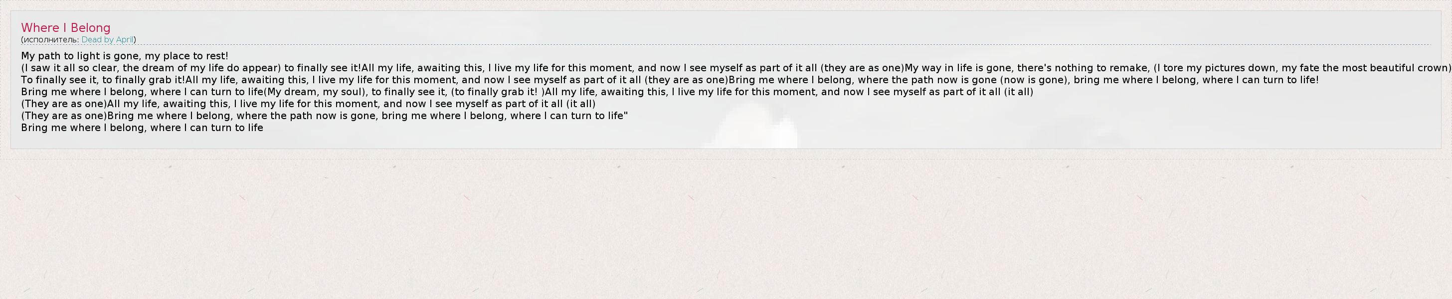 My path to light is gone, my place to rest! (I saw it all so clear, the dream of my life do appear) to finally see it!All my life, awaiting this, I live my life for this moment, and now I see myself as part of it all (they are as one)My way in life is gone, there's nothing to remake, (I tore my pictures down, my fate the most beautiful crown) To finally see it, to finally grab it!All my life, awaiting this, I live my life for this moment, and now I see myself as part of it all (they are as one)Bring me where I belong, where the path now is gone (now is gone), bring me where I belong, where I can turn to life! Bring me where I belong, where I can turn to life(My dream, my soul), to finally see it, (to finally grab it! )All my life, awaiting this, I live my life for this moment, and now I see myself as part of it all (it all) (They are as one)All my life, awaiting this, I live my life for this moment, and now I see myself as part of it all (it all) (They are as one)Bring me where I belong, where the path now is gone, bring me where I belong, where I can turn to life" Bring me where I belong, where I can turn to life